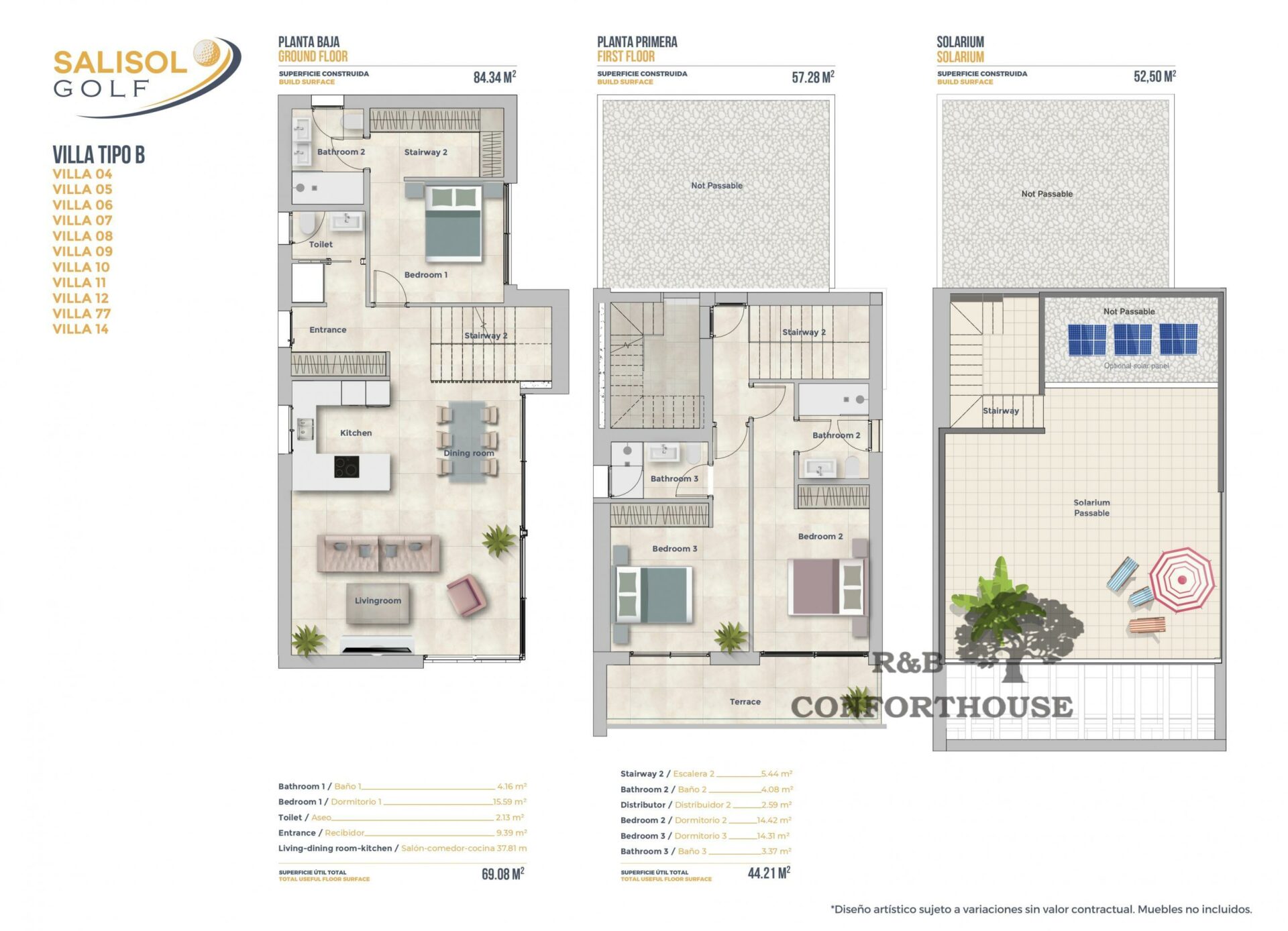 Each villa is a testament to modern architecture, featuring three spacious bedrooms and four luxurious bathrooms. These homes come fully furnished, so you can move in without a hitch. Plus, you’ll find a fully equipped kitchen with top-notch appliances, pre-installed air conditioning, and electric shutters. Want a private garden? That can be arranged based on the plans!