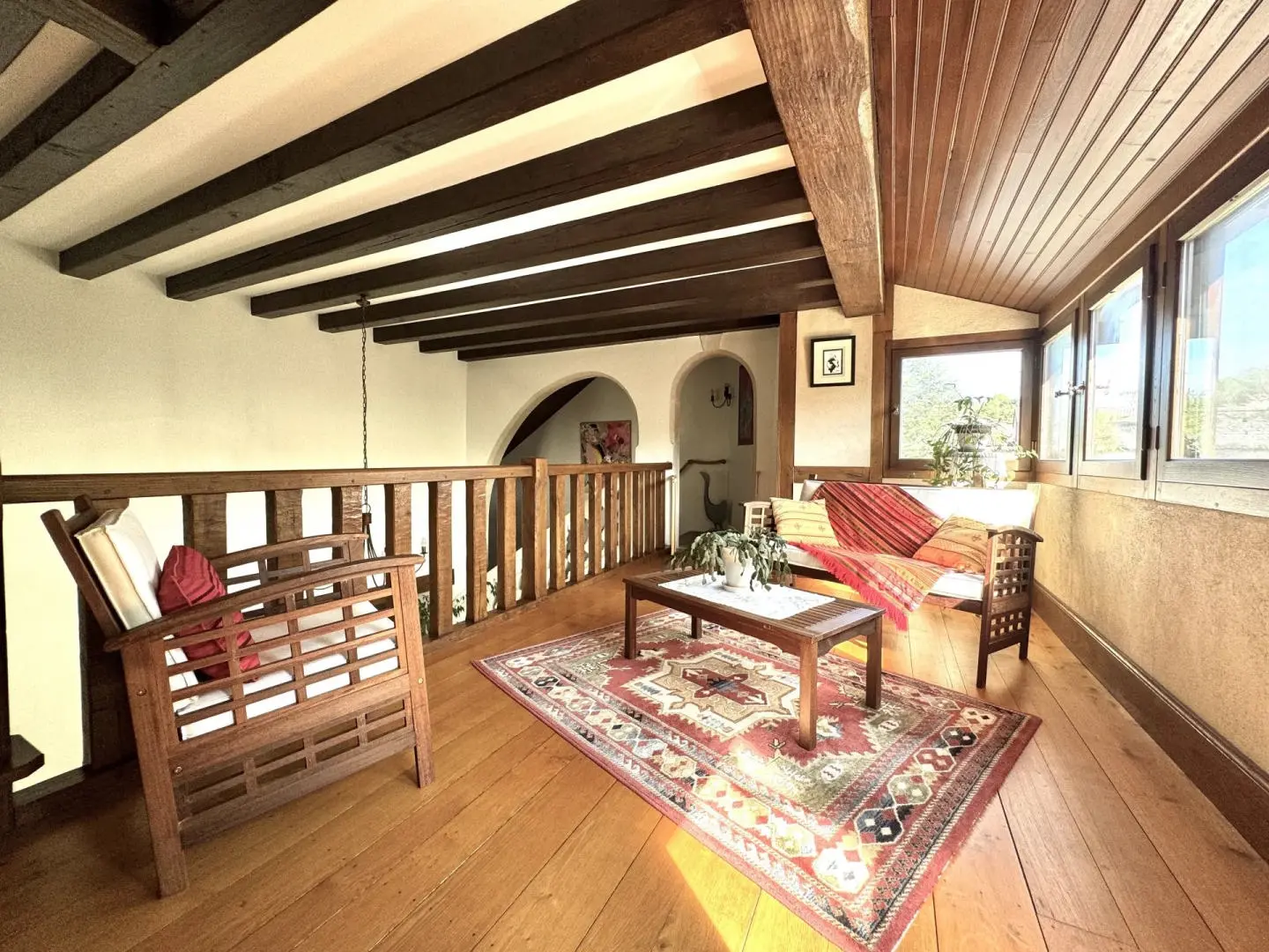 Perfect for nature lovers, sensational waterfalls and water features abound. The river basins are spanned by bridges for garden access, with romantic shady dining terraces and extensive grass areas and exotic plants. Vast secure 100 m² Garage/Workshop space and parking for numerous cars.
