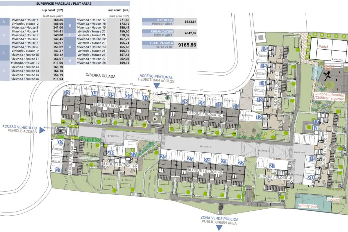 This new development, situated in La Nucia, Alicante, presents a distinctive Mediterranean setting. The location provides excellent views across the bays. The project includes a collection of 28 homes, designed as attached, semi-detached, and independent villas.