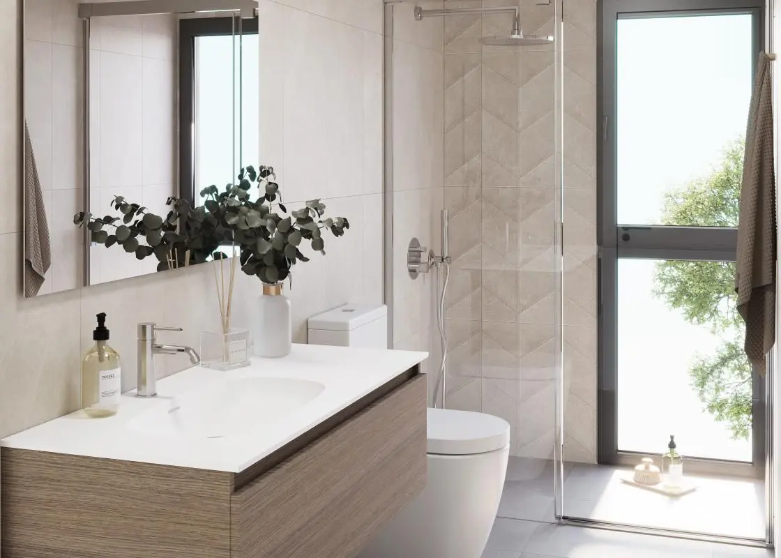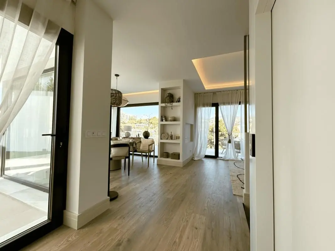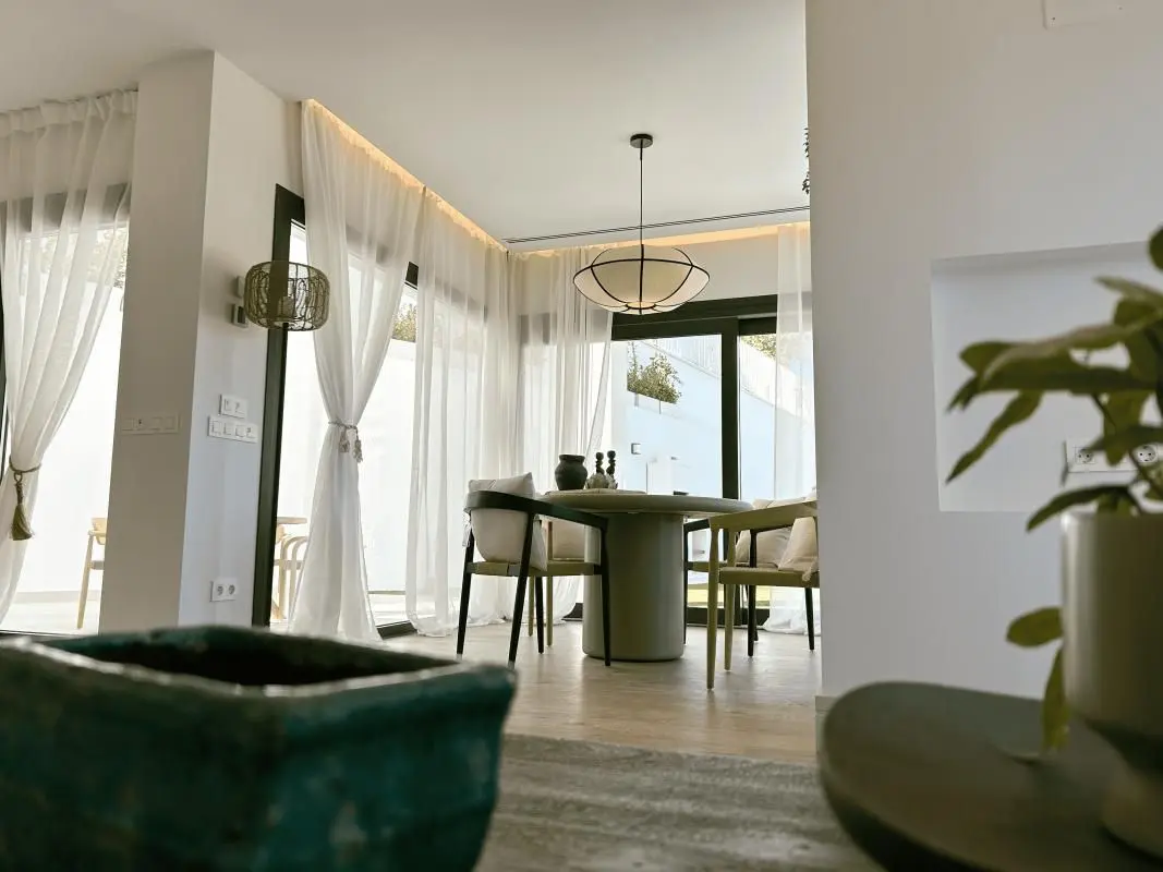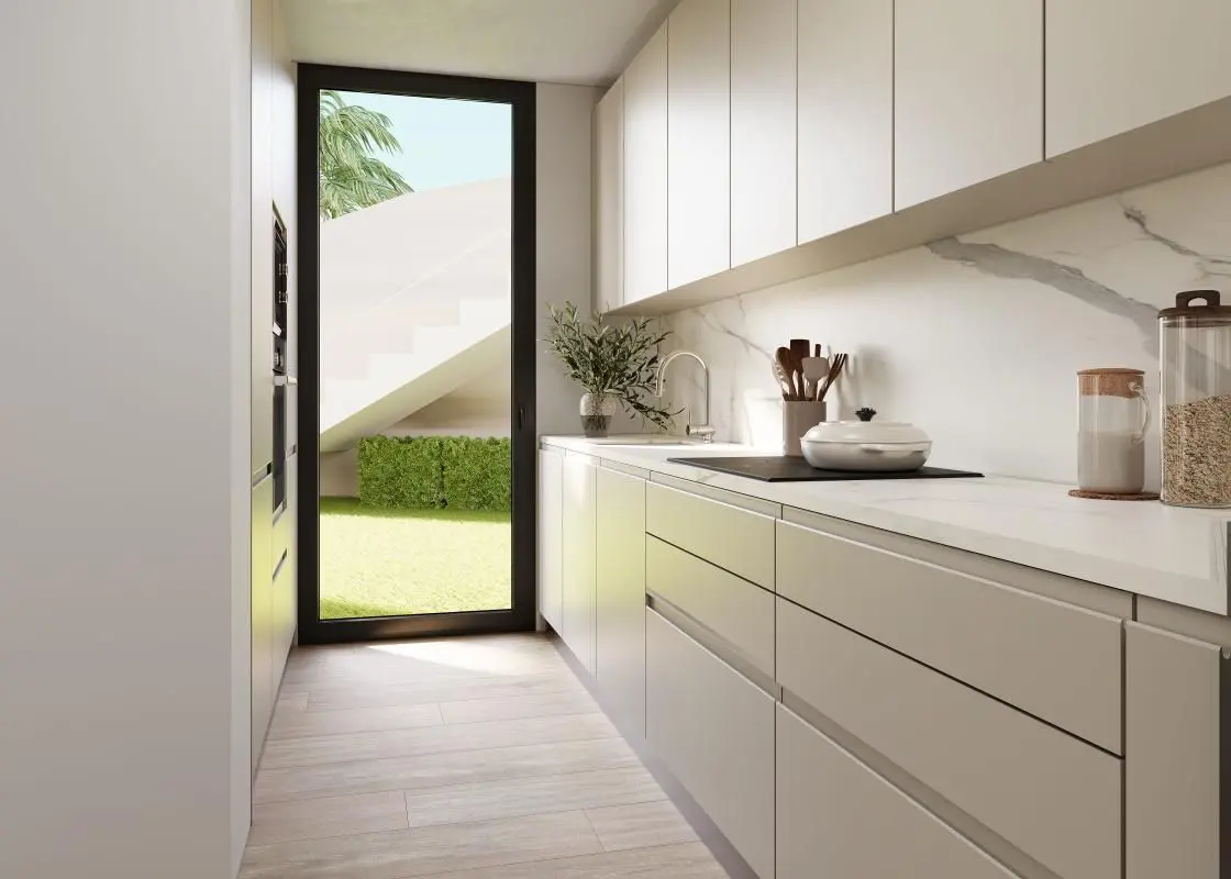 The ground floor of this new construction in Málaga is designed to maximize natural light and connect with the outdoor space. A large living room opens up through expansive windows, offering clear views of the private garden. This connection to the outdoors is a key element of the design. The kitchen is an open-plan concept, fitted with appliances that are considered high-end. It flows directly into the dining area, creating a unified space that is functional for daily use and suitable for hosting guests. The layout aims for practicality and ease of movement.
