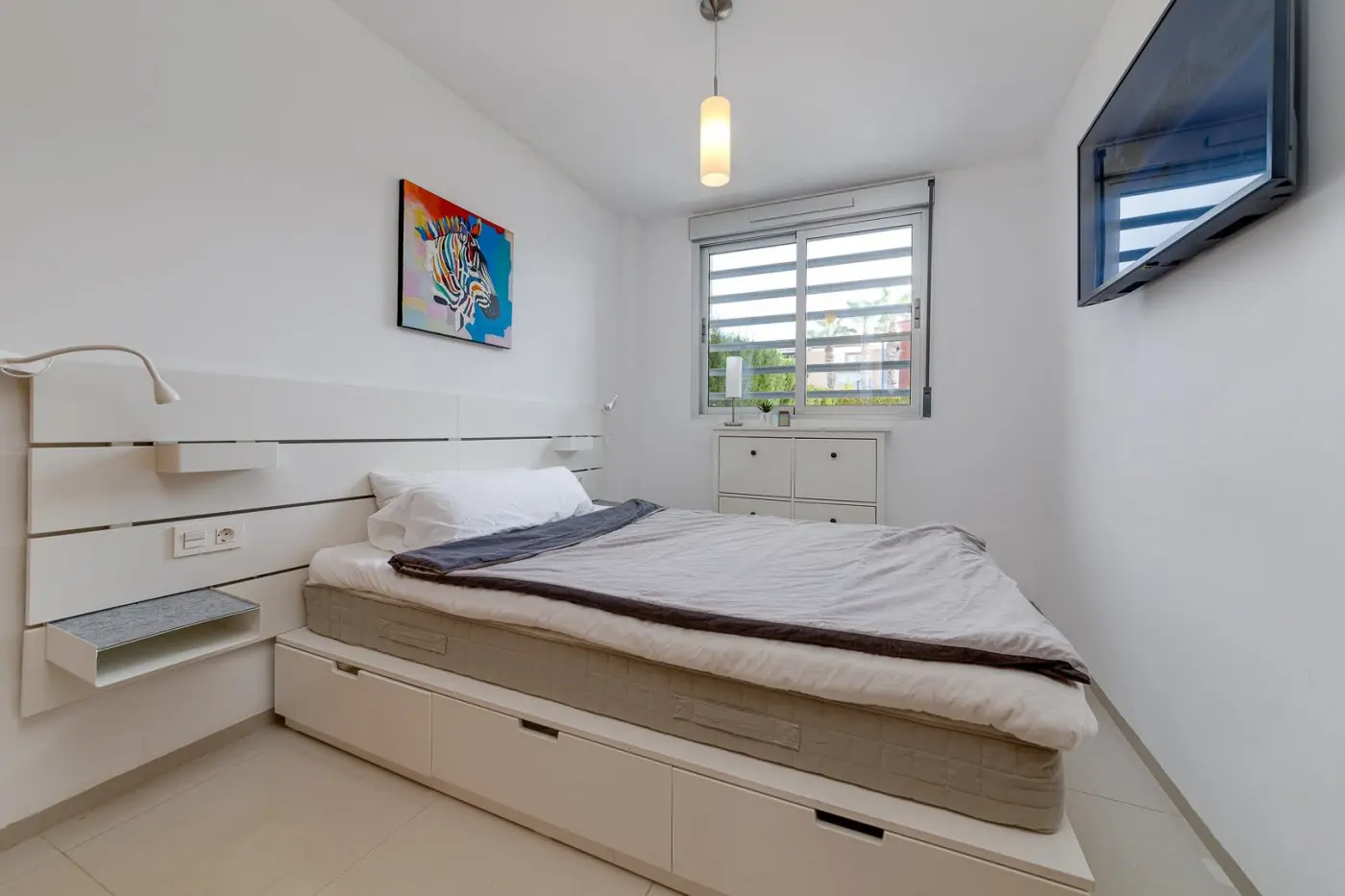 Stepping outside, the terrace overlooks a well-maintained courtyard. This area hosts a communal pool, padel courts, and a playground, enhancing the outdoor living experience. With ample space for relaxation, this setting is ideal for enjoying sunny days.