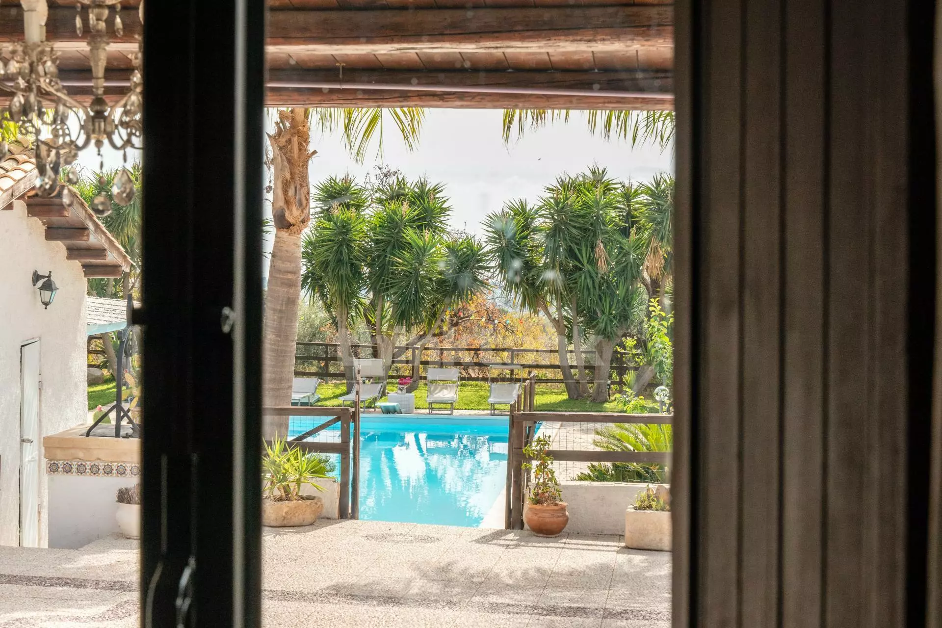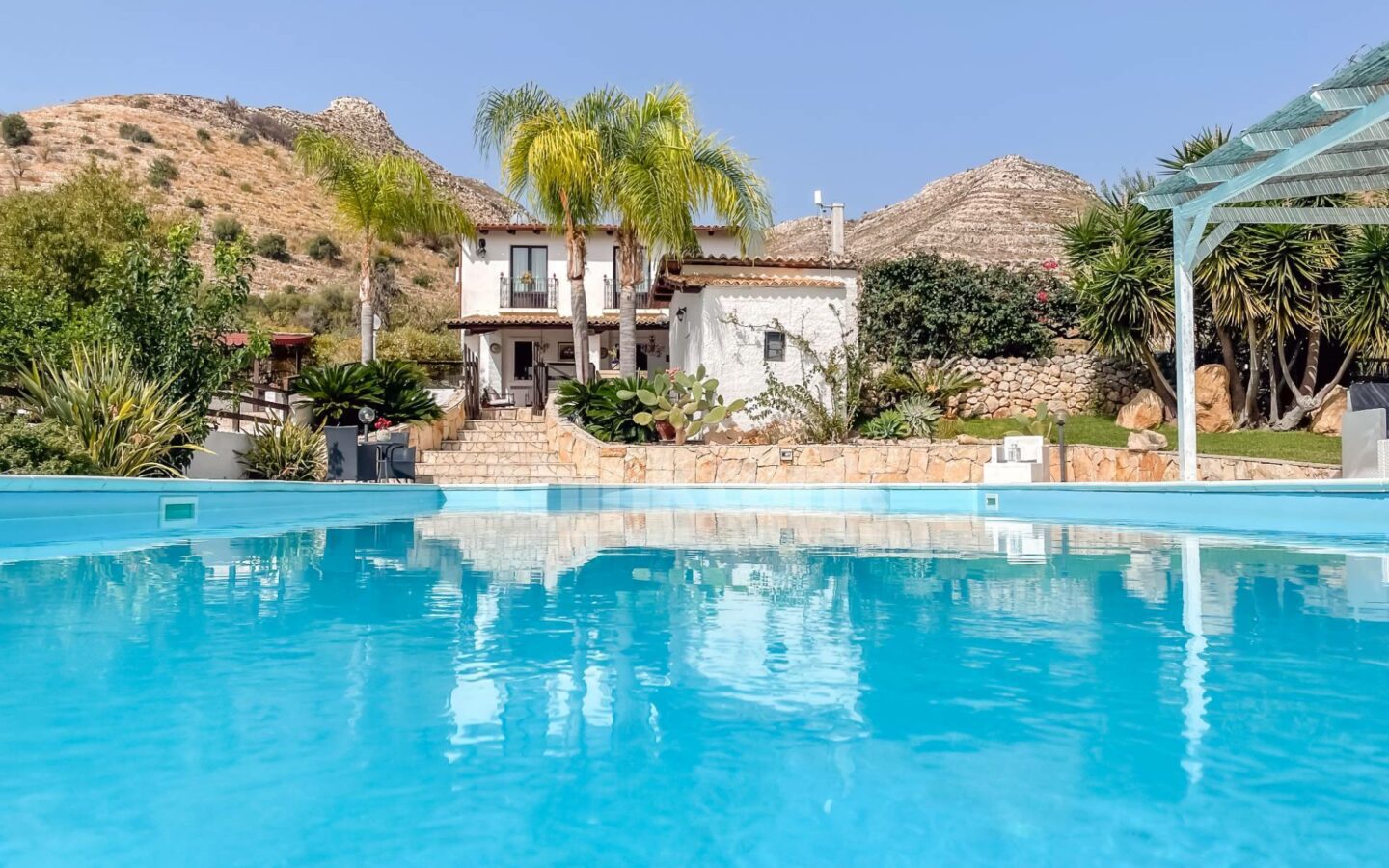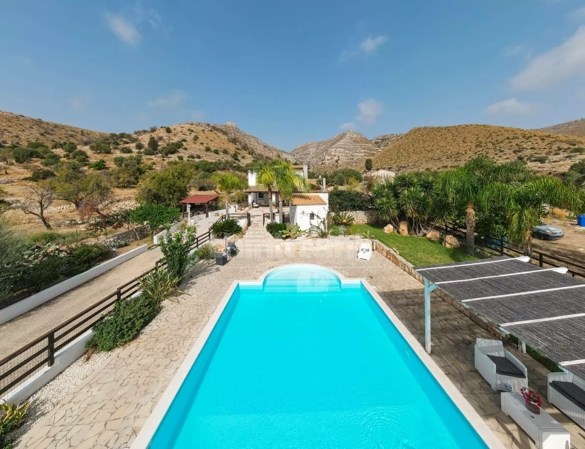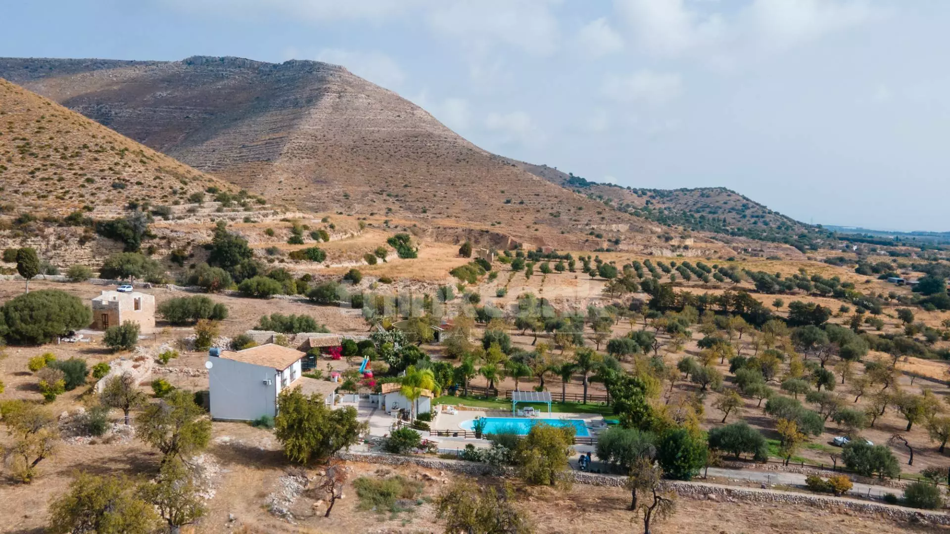 The villa features a swimming pool with a large surrounding solarium and a relaxation area with a wooden roof and comfortable sofas, perfect for spending moments under the Sicilian sun. The interiors are arranged over two levels: on the ground floor, a large open space welcomes guests with a built-in kitchen, a living room, and a bathroom. On the upper floor, three bedrooms with balconies offer views of the land and the swimming pool, with the sea of Avola as a backdrop.