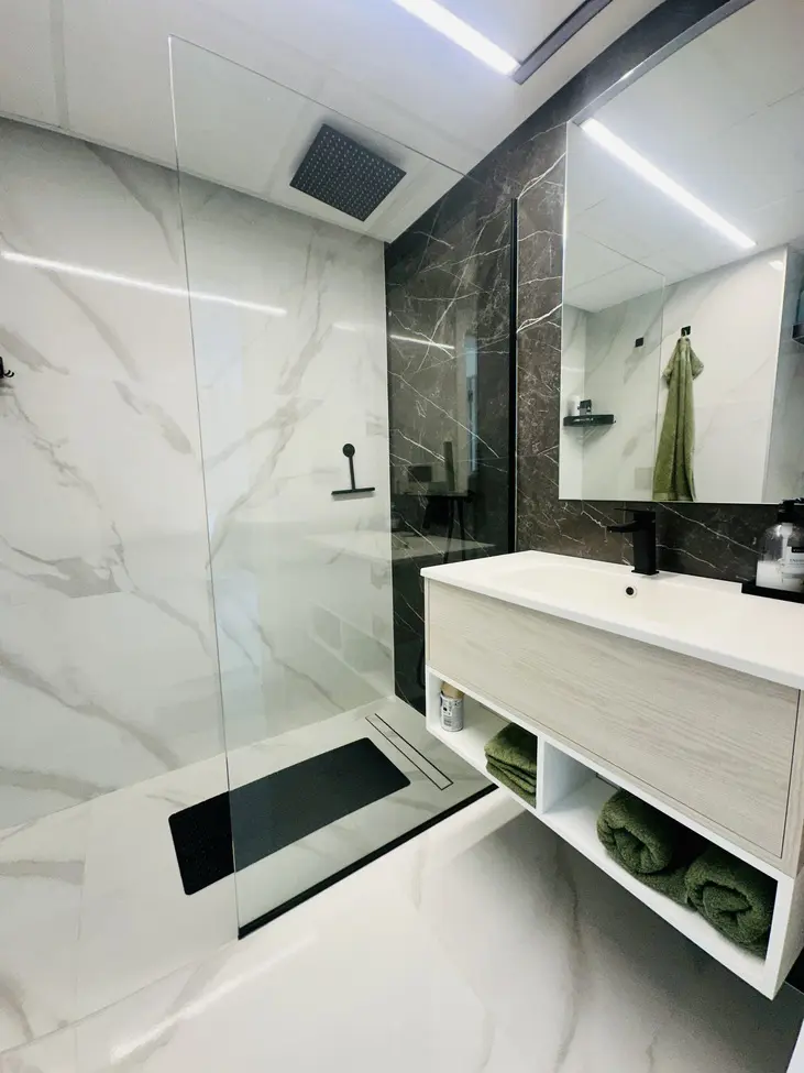 This penthouse includes two bedrooms. The master bedroom has its own en-suite bathroom, providing privacy and ease. The second bathroom also features a modern design with a marble look, adding a touch of sophistication to the overall layout.