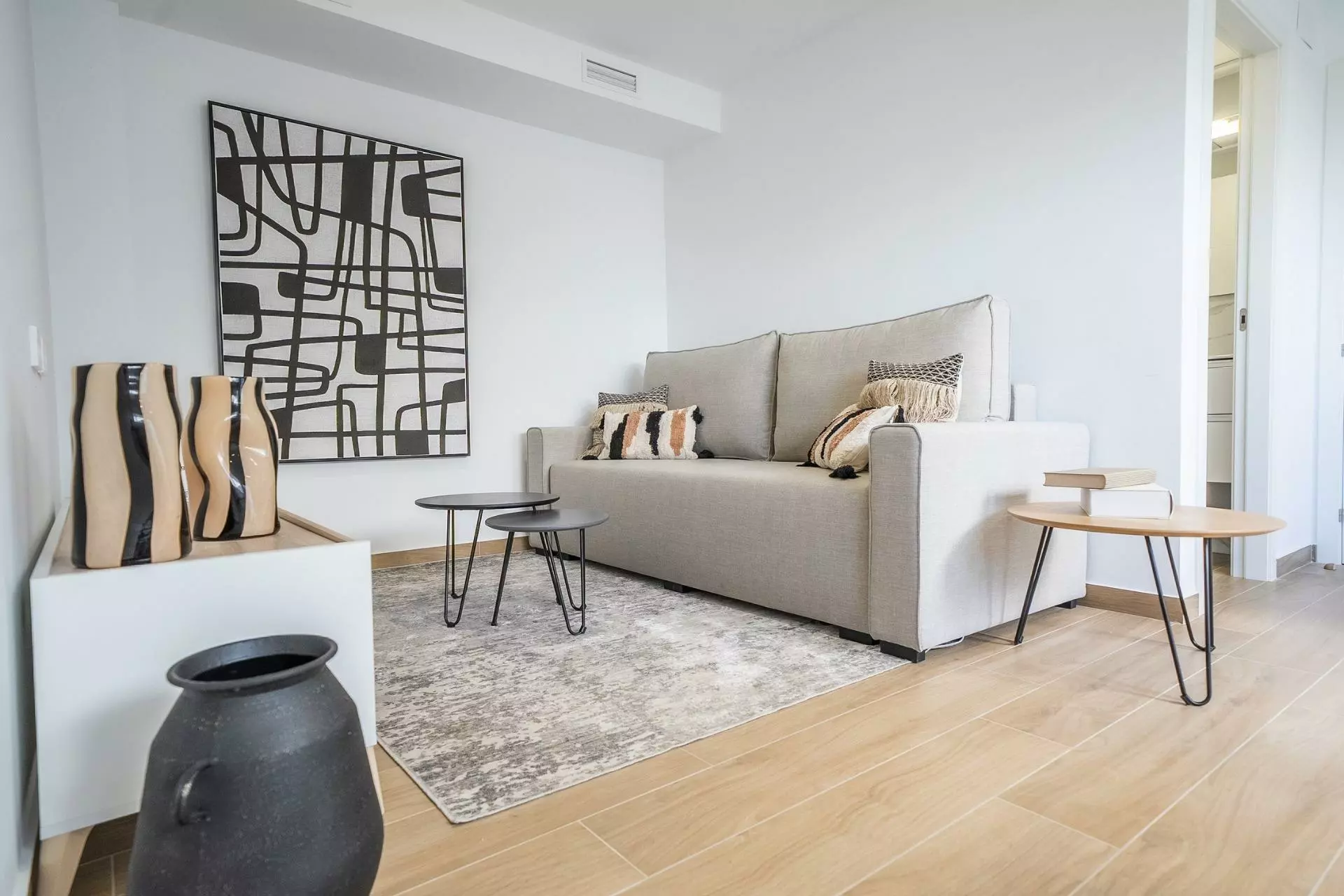 Each villa includes two bedrooms and two bathrooms. The open plan layout connects the kitchen and living room, providing an unobstructed view of the terrace. This design offers plenty of natural light, making the living space inviting. The properties also feature a semi-basement, solarium, and private garden, along with parking facilities.