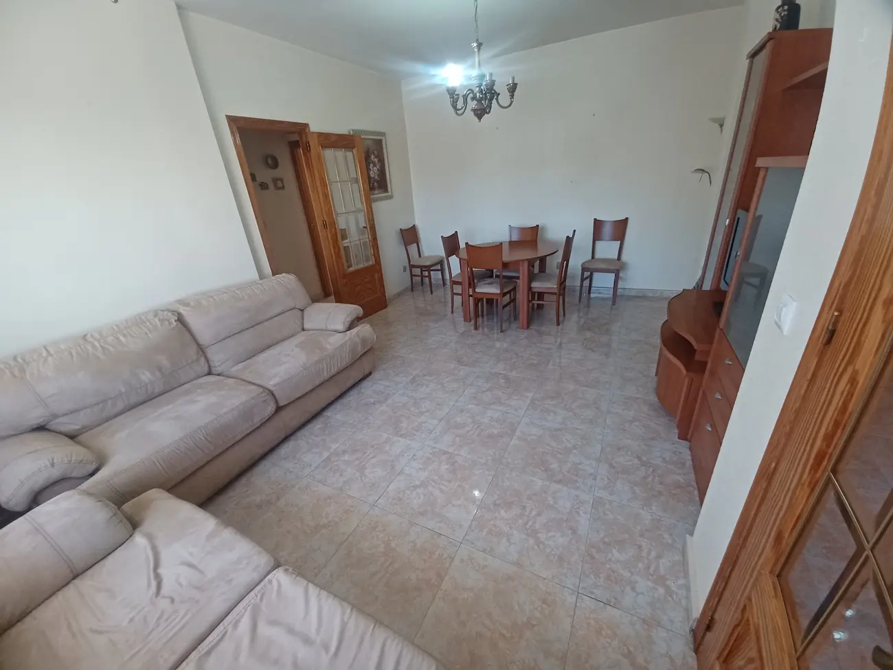 Upon entering, you will find a hallway that connects all rooms in the house. To the left of the hallway is the living room. This area features natural light and includes two cream sofas, a wooden round dining table with chairs, various storage units, and a TV unit. The configuration supports a functional, everyday living environment.