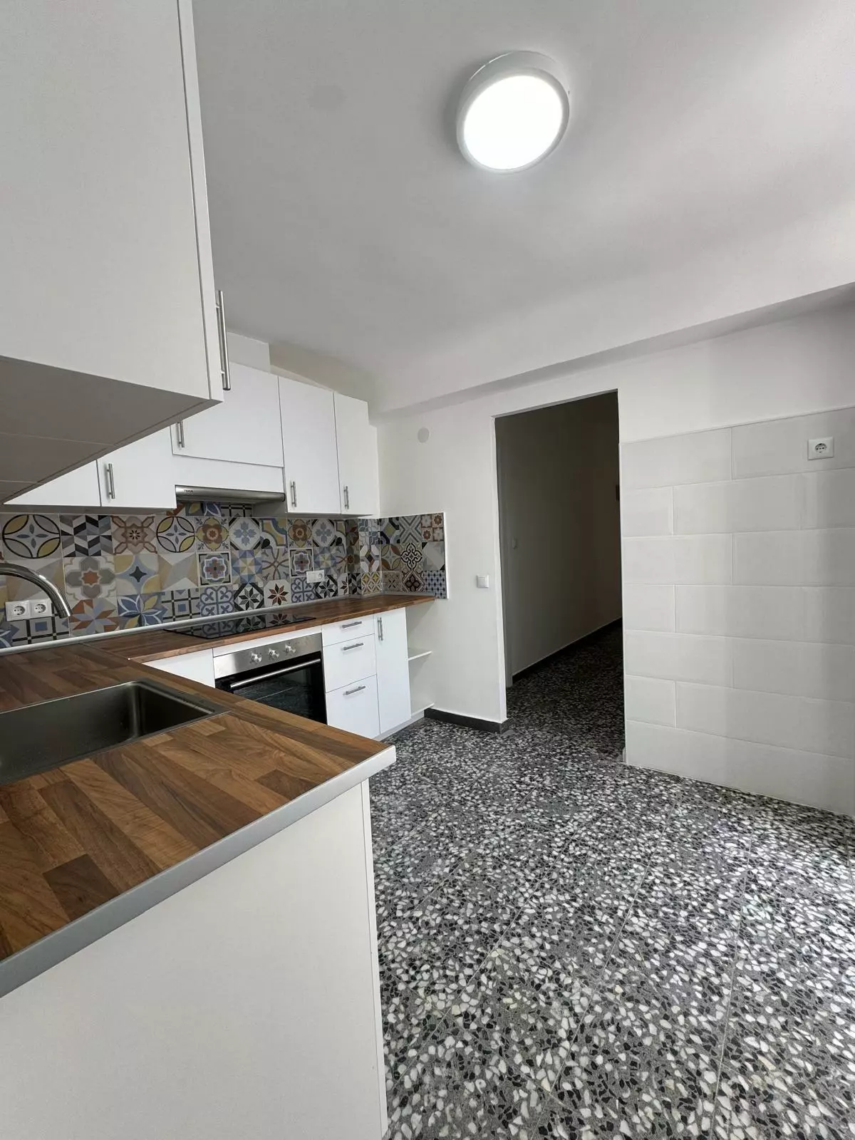 The kitchen is equipped with standard appliances and provides necessary storage space. The layout facilitates easy movement, helping with meal preparation and cooking. Access to outdoor areas may also exist, allowing for outdoor dining options.