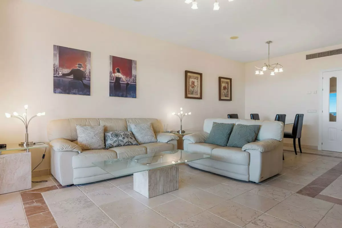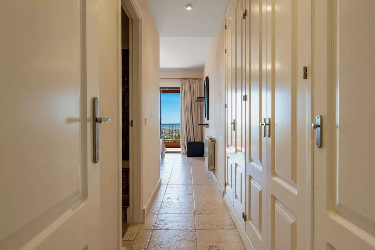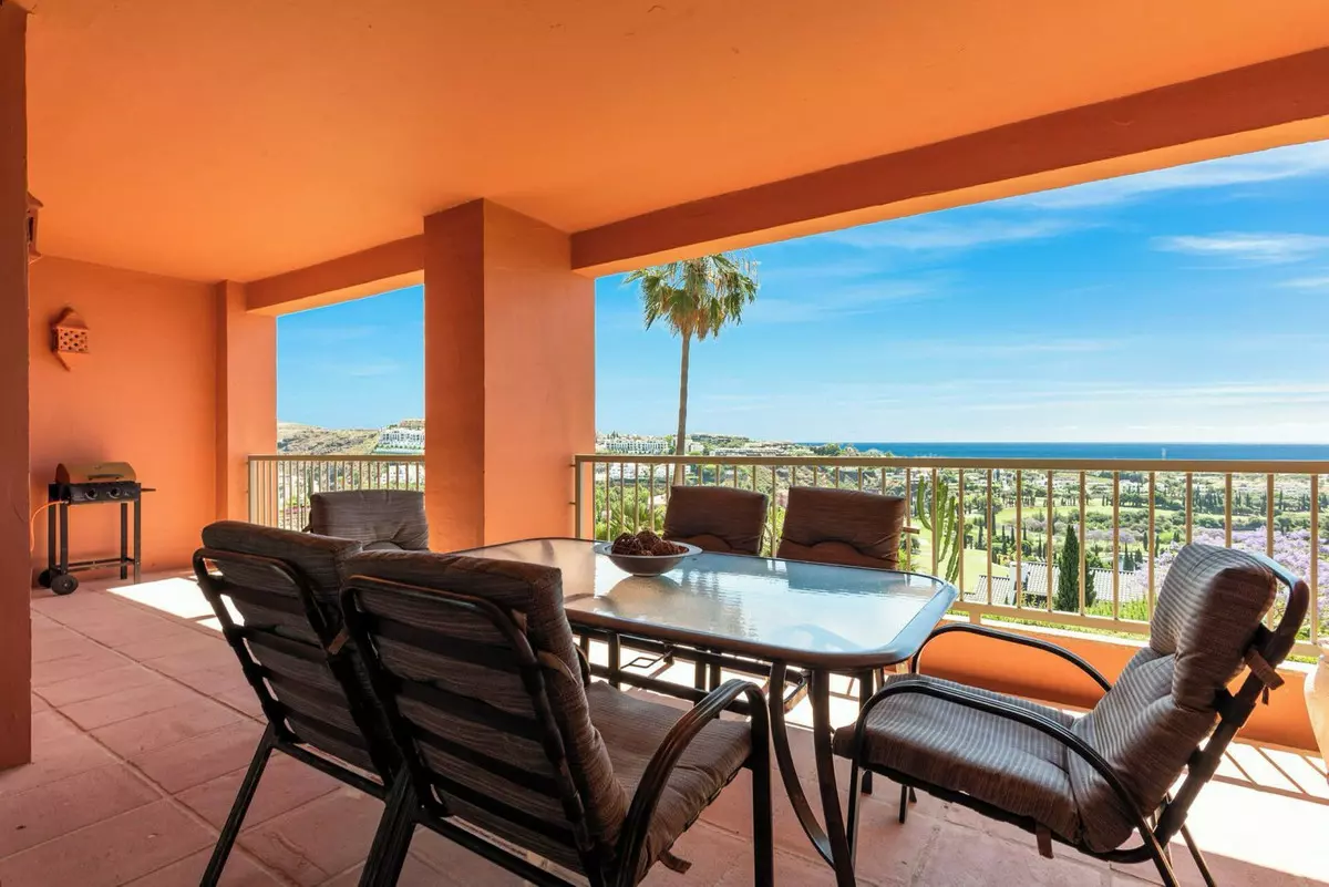 The apartment is positioned at an elevation, providing open views of the Los Flamingos Golf Course, a tranquil lake, and, on clear days, the Mediterranean Sea extending to the African coast. A private terrace is accessible from the living area, which allows residents to appreciate the surrounding landscape while enjoying outdoor meals or morning beverages.