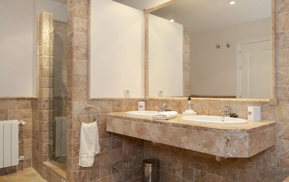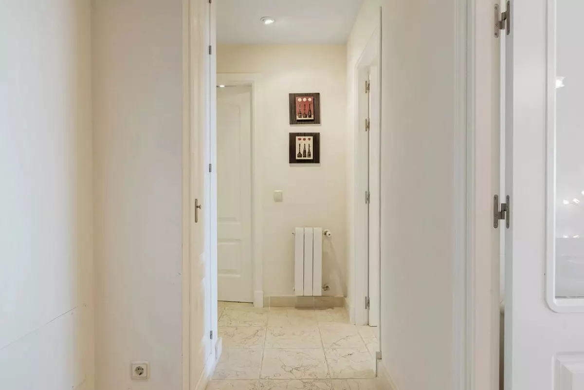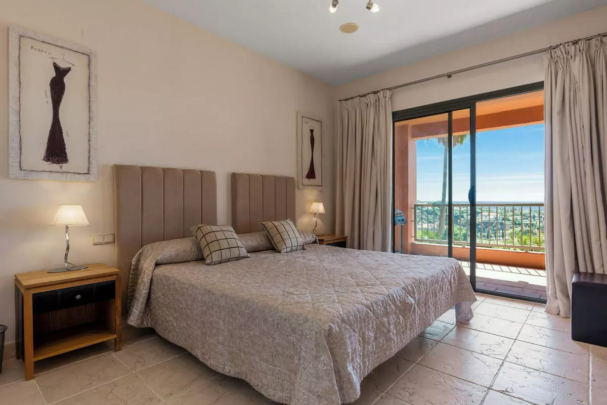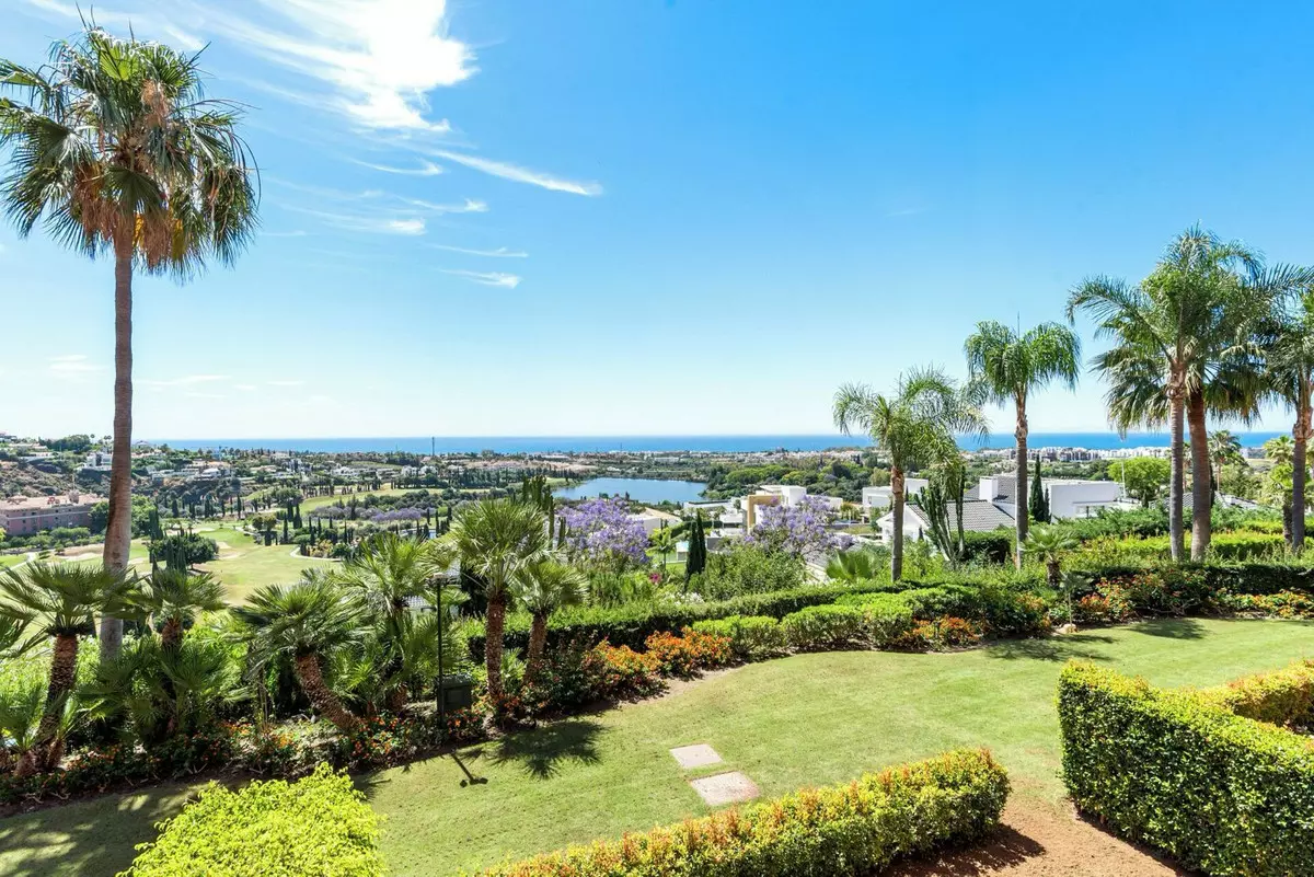 The apartment is positioned at an elevation, providing open views of the Los Flamingos Golf Course, a tranquil lake, and, on clear days, the Mediterranean Sea extending to the African coast. A private terrace is accessible from the living area, which allows residents to appreciate the surrounding landscape while enjoying outdoor meals or morning beverages.
