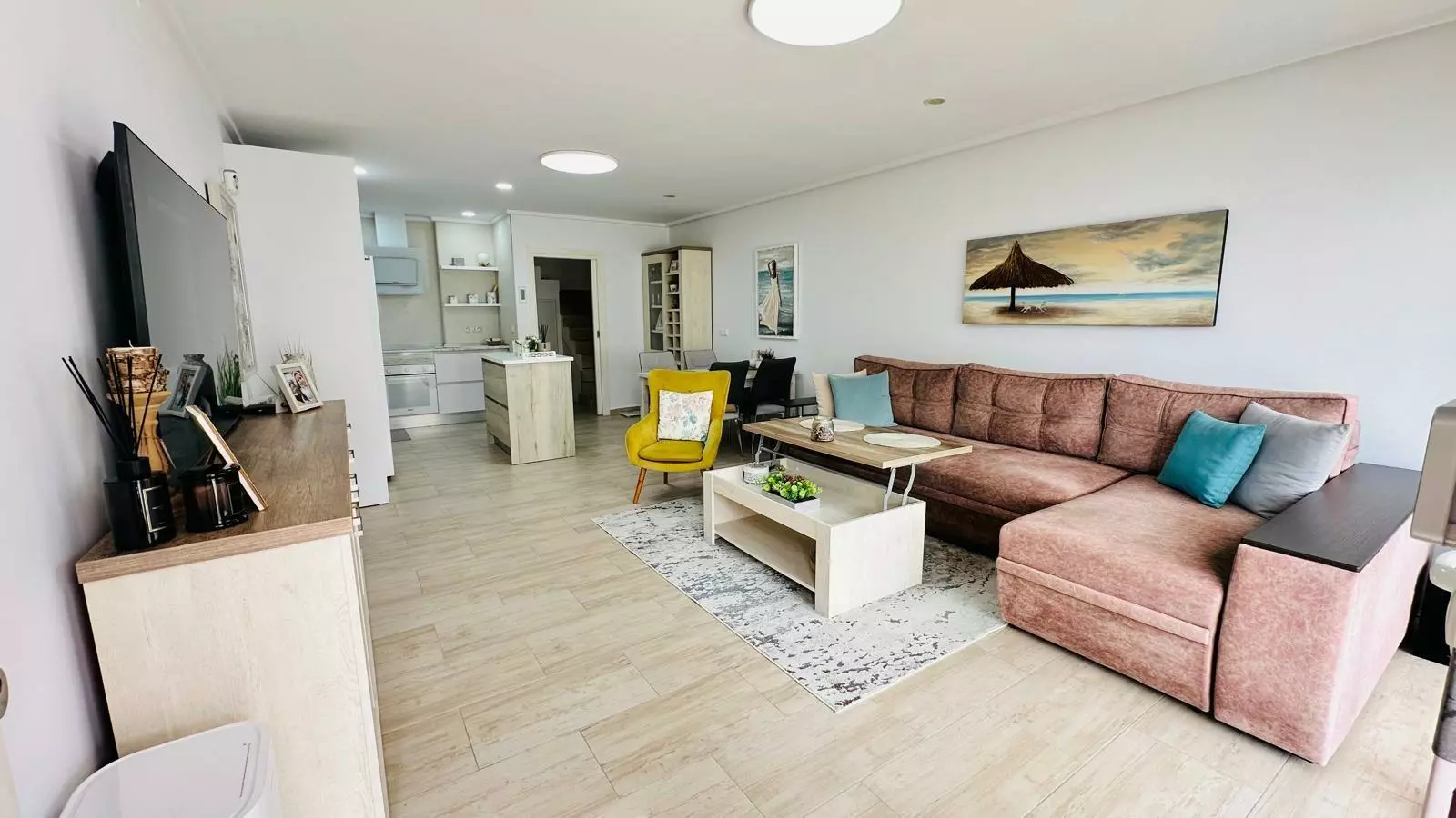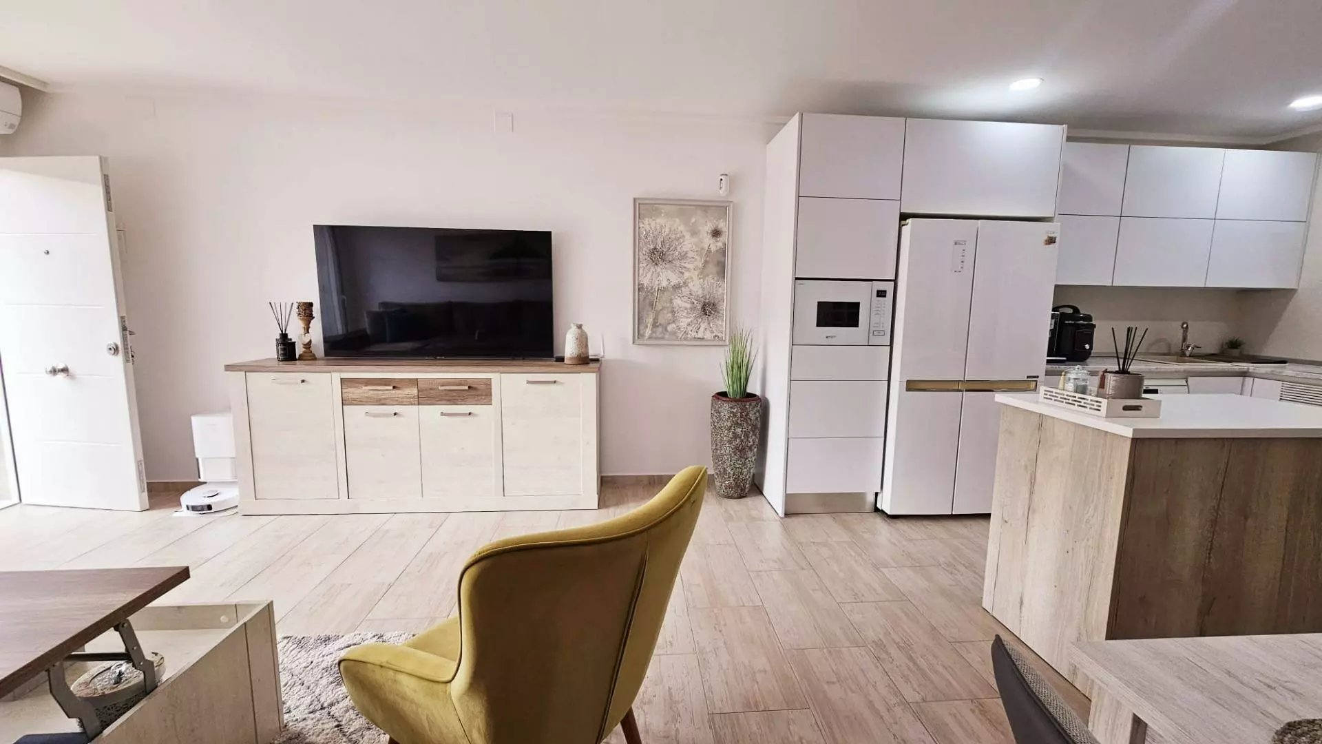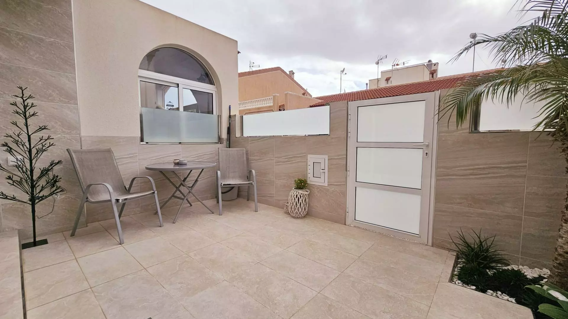 This duplex consists of three levels. Upon entering, you are greeted by a patio, which serves as a comfortable space to enjoy morning coffee or simply soak up the sun. The living room features French windows that enhance the brightness and sense of openness in the area.