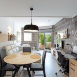As you step inside, you’ll find a private terrace that welcomes you into a bright open-plan area. The layout merges the lounge, dining room, and contemporary kitchen, creating a versatile environment that works well for daily activities and entertaining guests. This design fosters interactivity, allowing family members to stay connected while engaging in different activities.