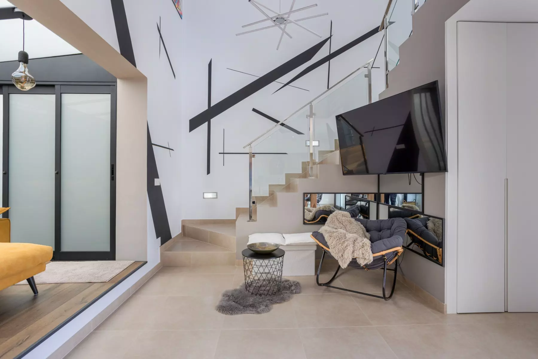 The property radiates modern design and functionality, featuring a bright open-plan living area flowing seamlessly into a fully equipped kitchen. Large windows flood the space with natural light and connect directly to the terrace and private pool € heated with a heat pump for year-round enjoyment.