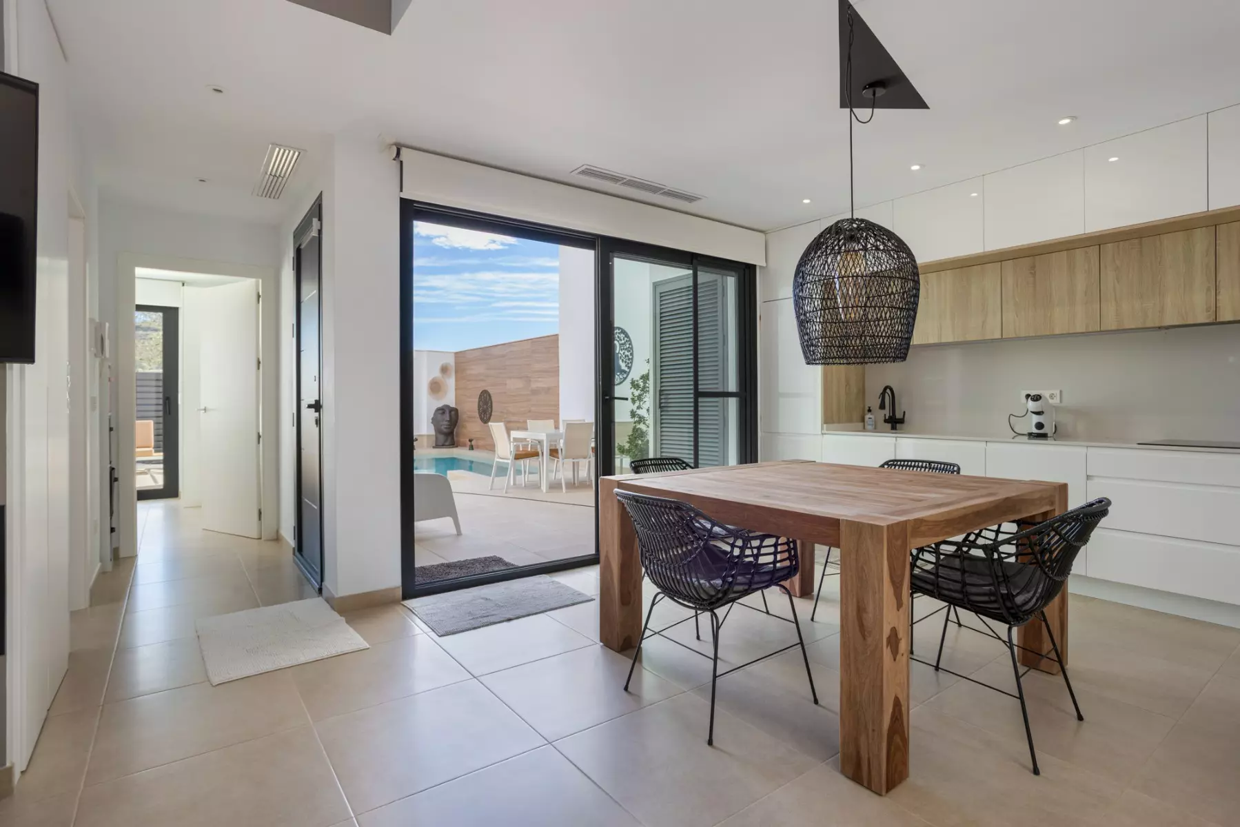 The property radiates modern design and functionality, featuring a bright open-plan living area flowing seamlessly into a fully equipped kitchen. Large windows flood the space with natural light and connect directly to the terrace and private pool – heated with a heat pump for year-round enjoyment.