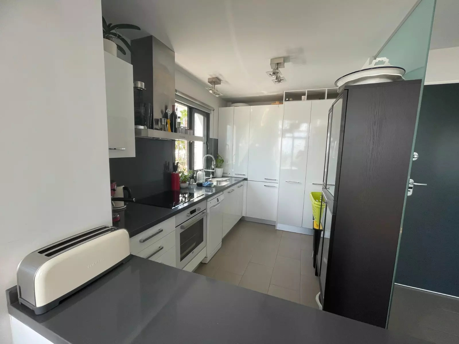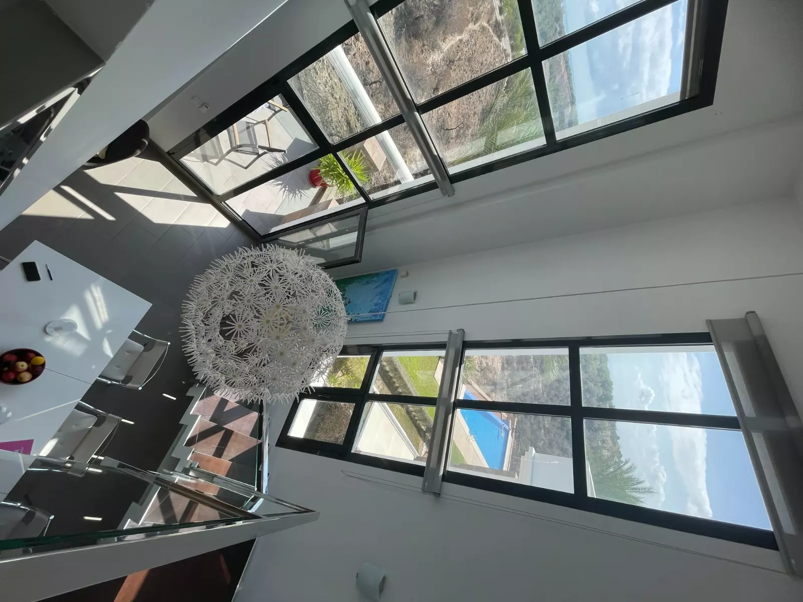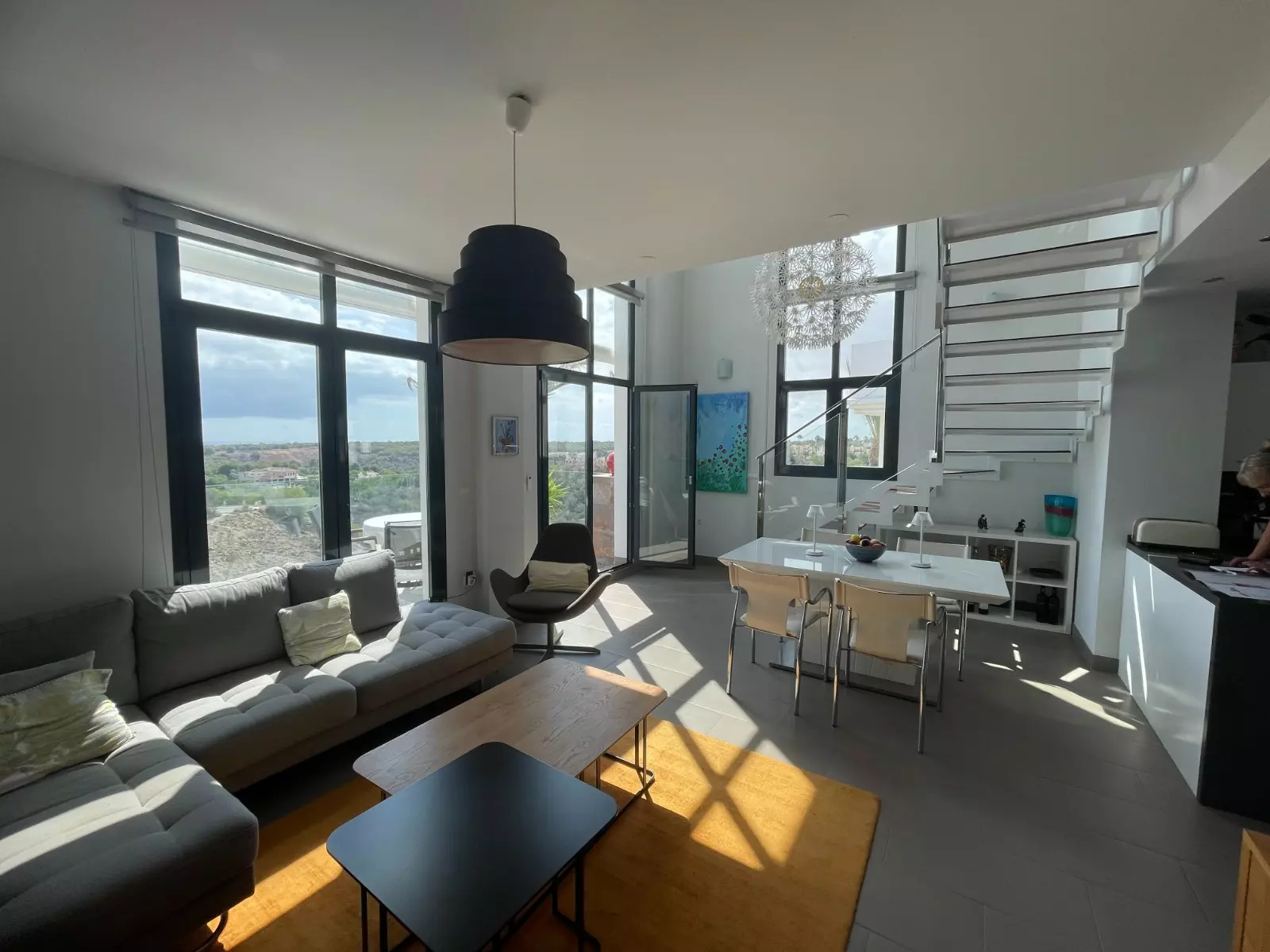 This penthouse offers a modern architectural design, encompassing 97 square meters across two floors. One notable advantage is that the main living area is conveniently situated at ground level, allowing for easy access without having to navigate stairs every time. The lounge and dining area is bright and airy due to two sets of glazed sliding doors that open up to a terrace. Thanks to the vaulted ceiling and an open stairway, the room enjoys a particular spaciousness, further enhanced by a floor-to-ceiling feature window that provides remarkable views.