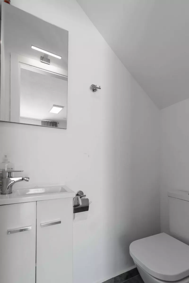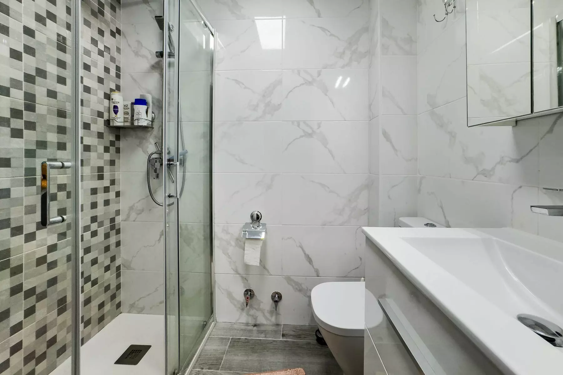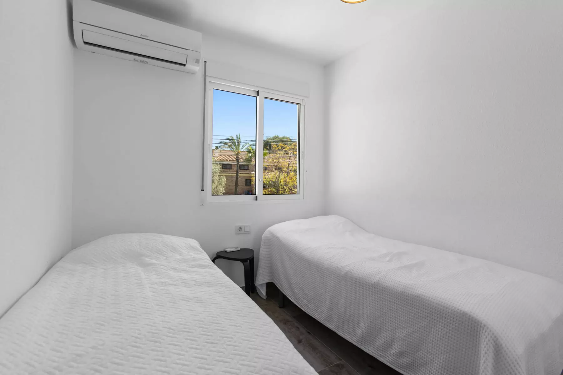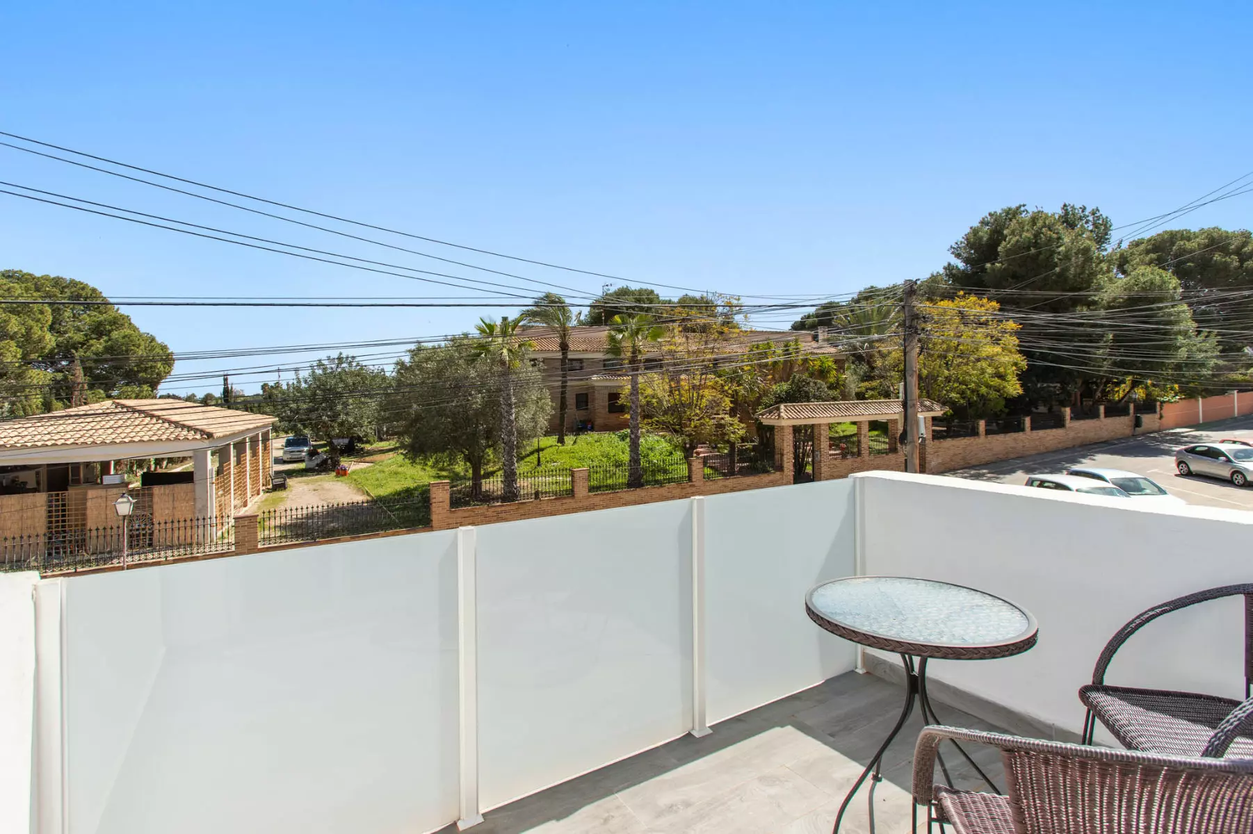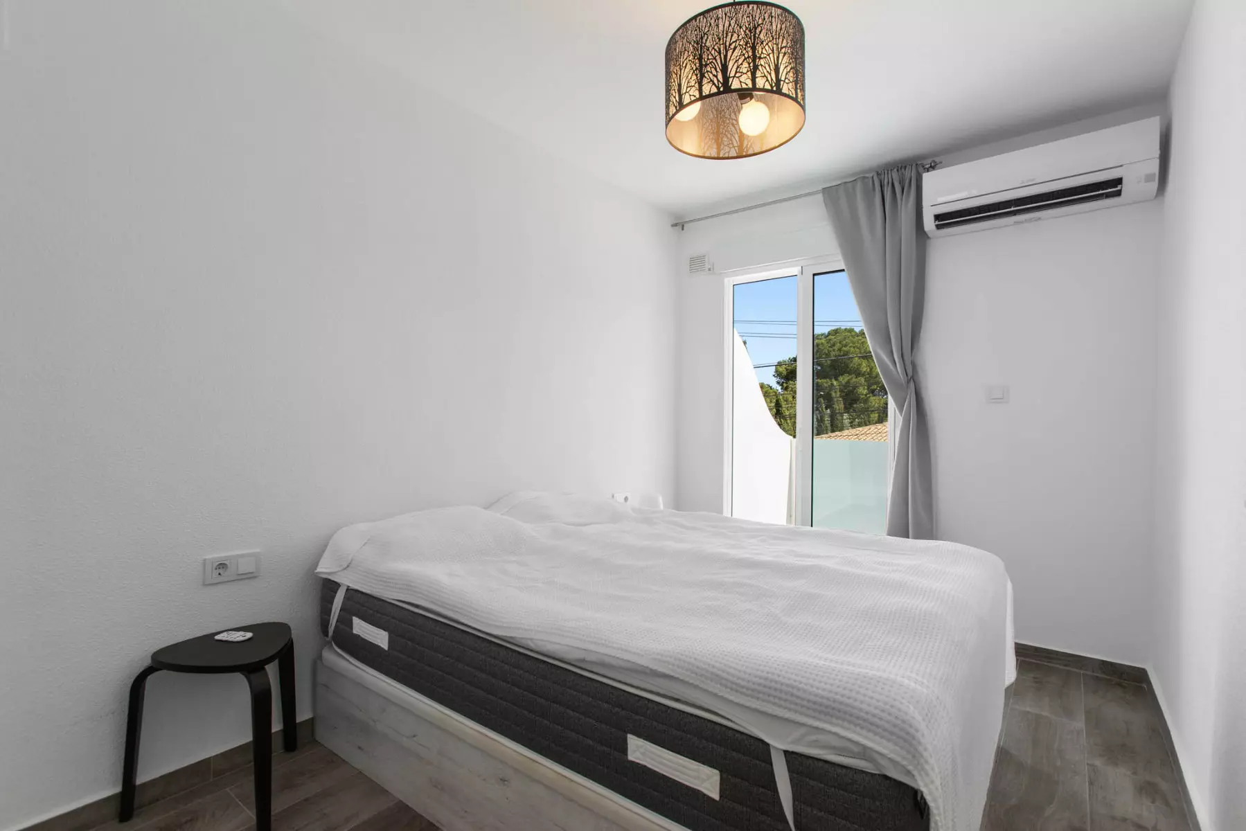 On the upper level, you will find two bedrooms, each equipped with large built-in wardrobes, along with a newly renovated bathroom. The entire property underwent refurbishment in 2023 using high-quality materials, showcasing updated surfaces and modern finishes. Three air heat pumps are installed to maintain a comfortable atmosphere throughout the year.