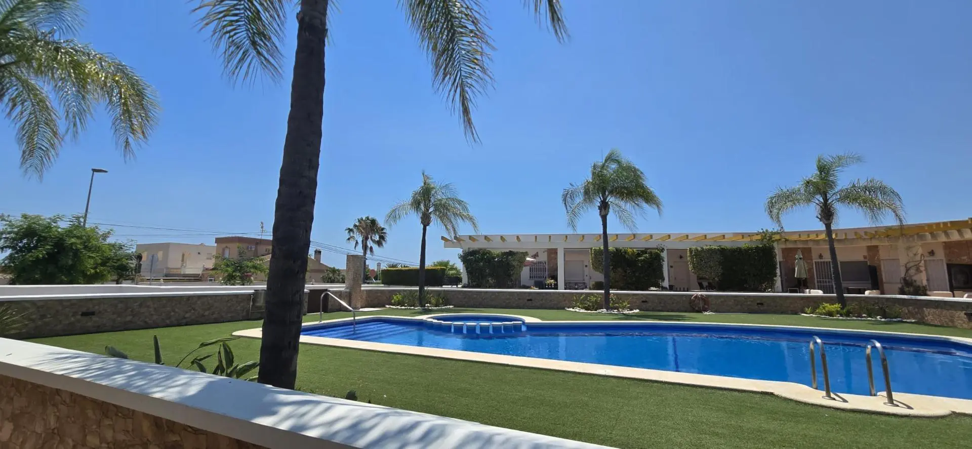 Welcome to your next potential home in Mil Palmeras. This corner terraced house offers a practical layout with useful features. It includes two south-facing bedrooms that benefit from sunlight throughout the day and provide views of the communal pool.