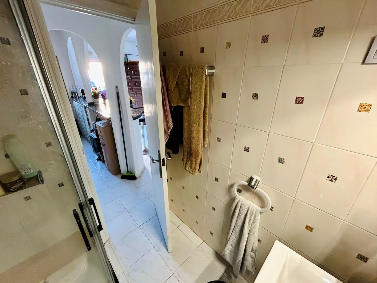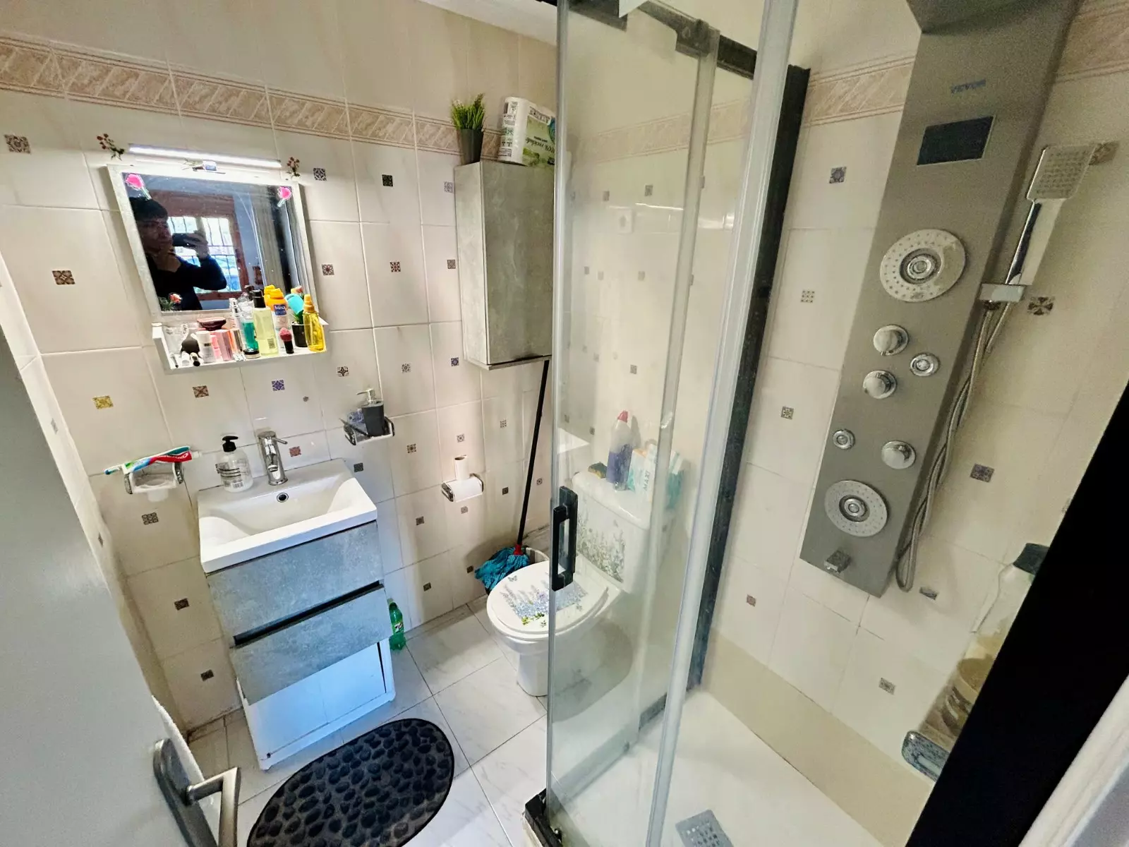 The kitchen offers ample storage options, allowing for efficient organization. Additionally, this level includes a storage room, accommodating both a washing machine and a water heater. For convenience, there is also a full bathroom with a shower on the ground floor.