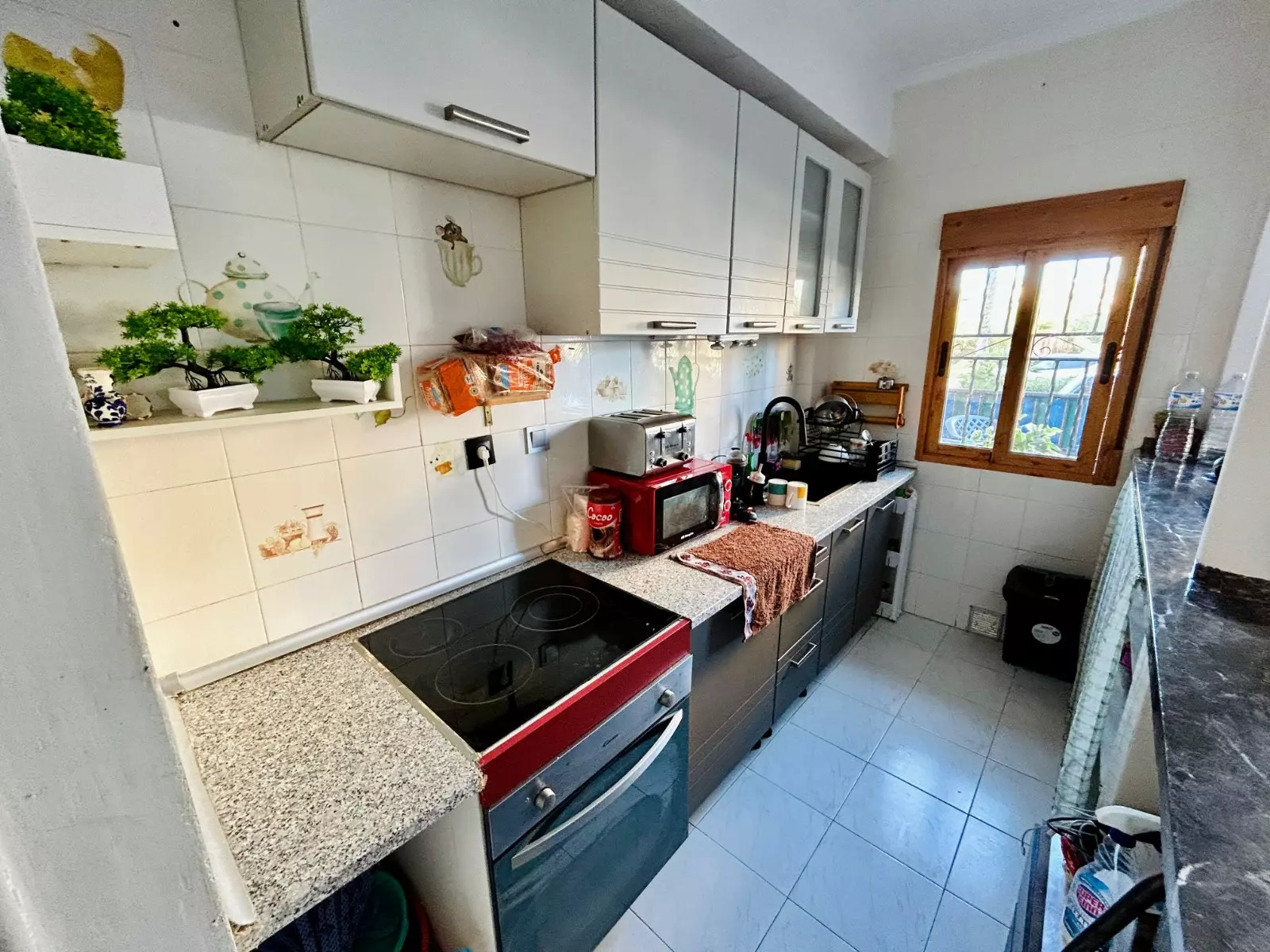 This house is located on the ground floor, featuring a terrace facing north. This outdoor space is suited for various types of furniture, perfect for enjoying outdoor experiences. As you step inside, you’ll find an open-plan layout combining the living room and dining area with a fully equipped kitchen. This setup maximizes the available space, allowing for easy interaction and movement.