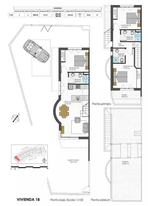 For those interested in bungalows, the ground floor units feature their own private garden, while the top floor options are complemented by a private solarium, ideal for outdoor activities or sunbathing. Each property is designed with practicality in mind, as all include private parking spaces and storage rooms.