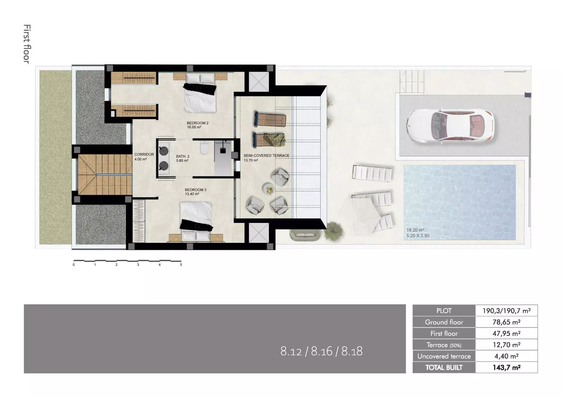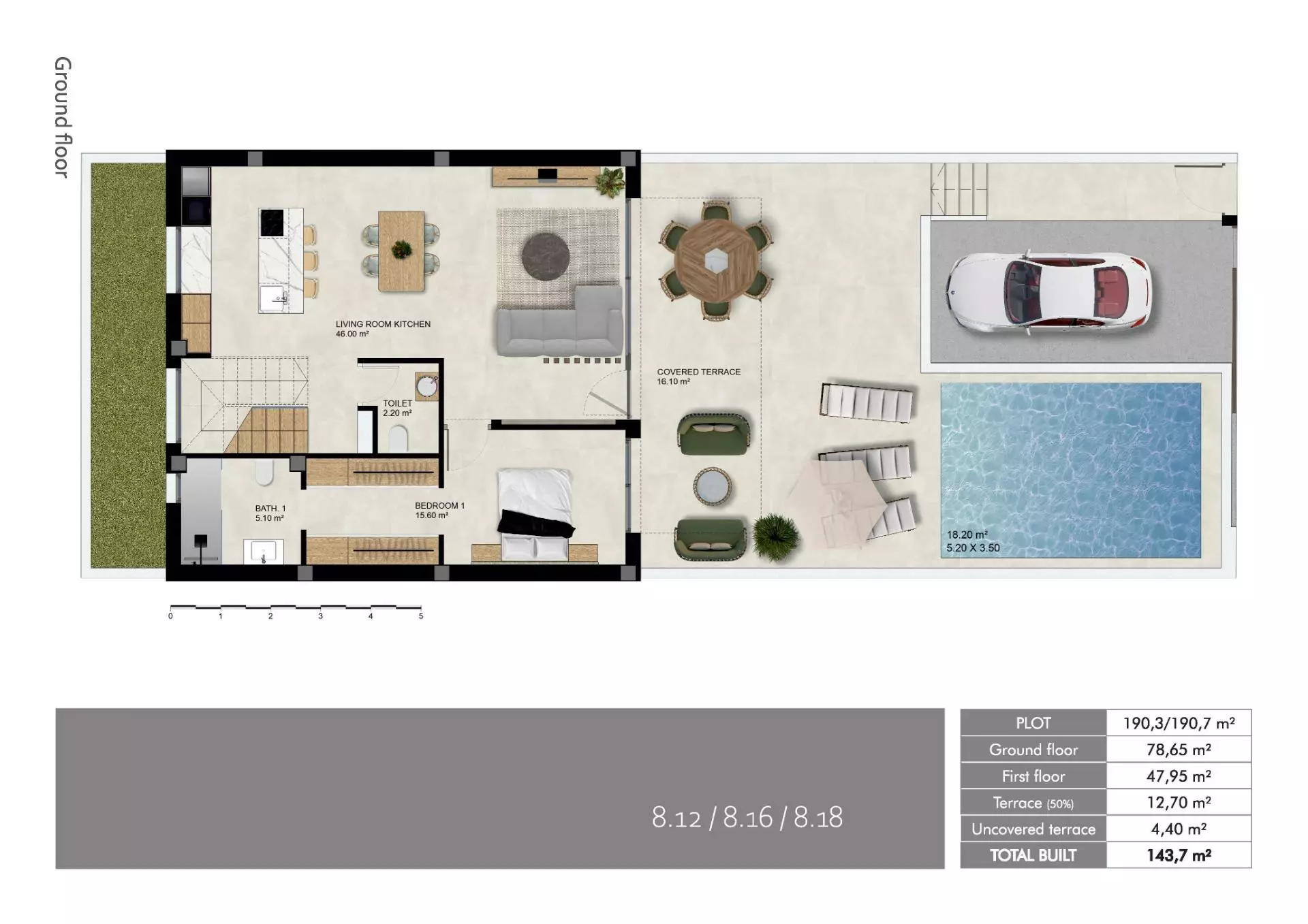 Each villa in this development is designed across two floors and includes several key features. These homes come with 3 bedrooms, 2 full bathrooms, and an additional guest toilet. The open-plan kitchen includes an island and is fully furnished and equipped with necessary appliances. The living-dining area is bright and provides direct access to the terrace. Additionally, each villa has a private garden that incorporates a swimming pool, a filtration system, and LED lighting. On-site parking is also available within the property.