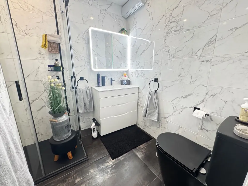 The townhouse comprises a sizable living area and a fully equipped kitchen. Both bedrooms are designed with ample space and come with fitted wardrobes and air conditioning. The family shower room is equipped with quality sanitary ware, ensuring functionality. The property also includes external access to a solarium, which offers views of the communal pool and green spaces.