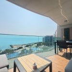 The townhouse comprises a sizable living area and a fully equipped kitchen. Both bedrooms are designed with ample space and come with fitted wardrobes and air conditioning. The family shower room is equipped with quality sanitary ware, ensuring functionality. The property also includes external access to a solarium, which offers views of the communal pool and green spaces.