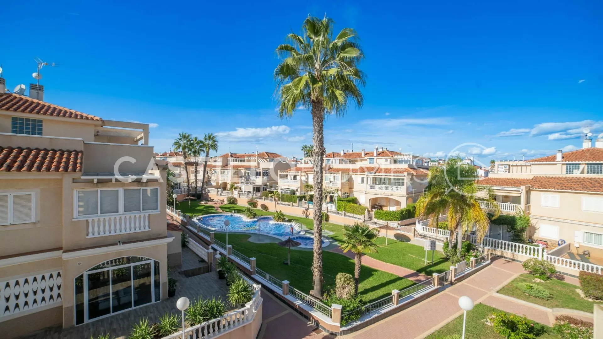 The second floor features two bedrooms, both with built-in wardrobes, providing ample storage solutions. A full bathroom accompanies the bedrooms, creating an environment focused on practicality and comfort. The layout promotes privacy, which is essential for any household. Moving up to the third floor, you will find an extra space that offers flexibility. This could serve as an office, an additional bedroom, or even a playroom, depending on your needs. From this level, you can access a spacious rooftop terrace that enables outdoor entertaining or personal relaxation while offering views of the two communal pools. One of these pools includes a jacuzzi, adding a leisure aspect to your outdoor time.
