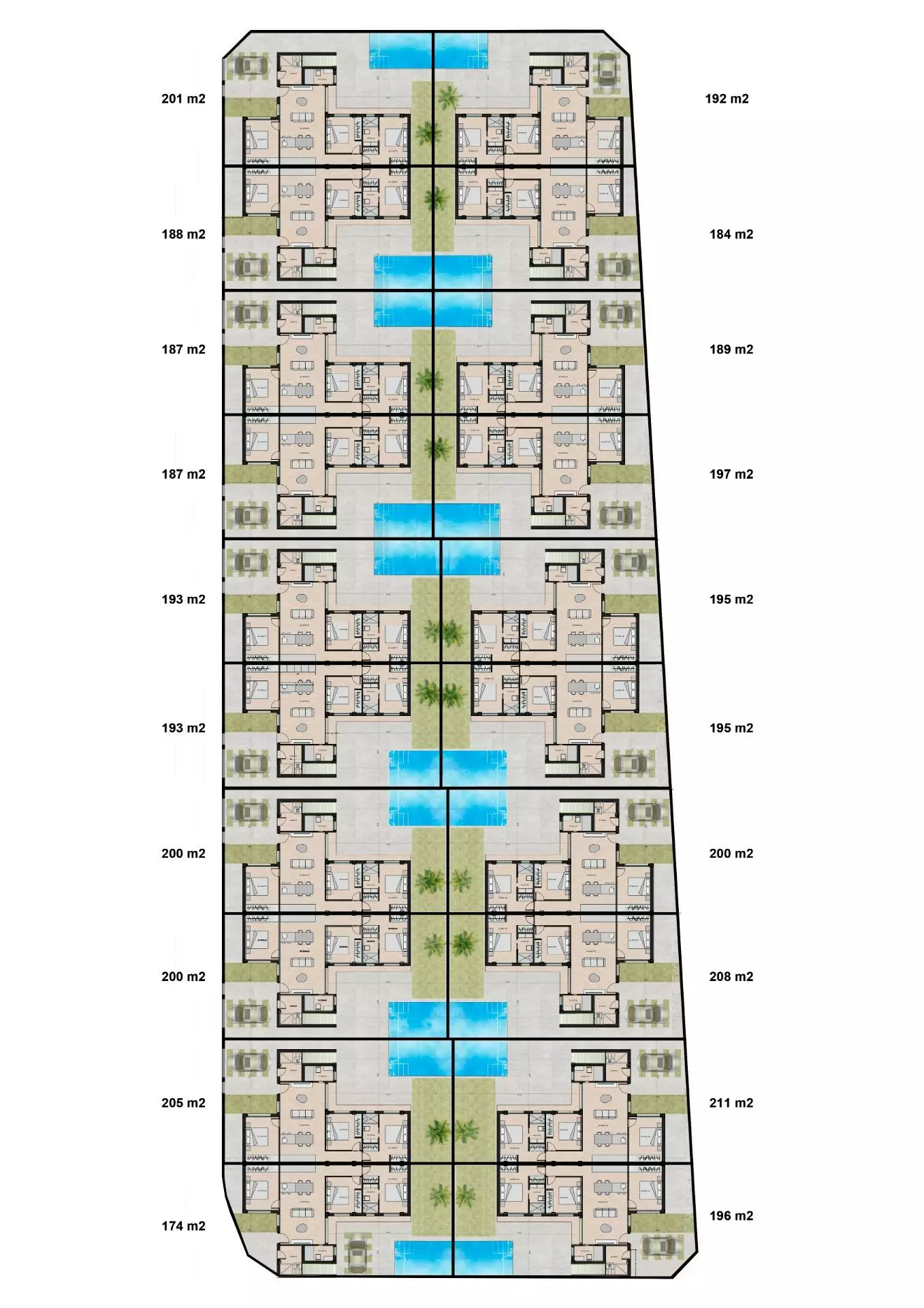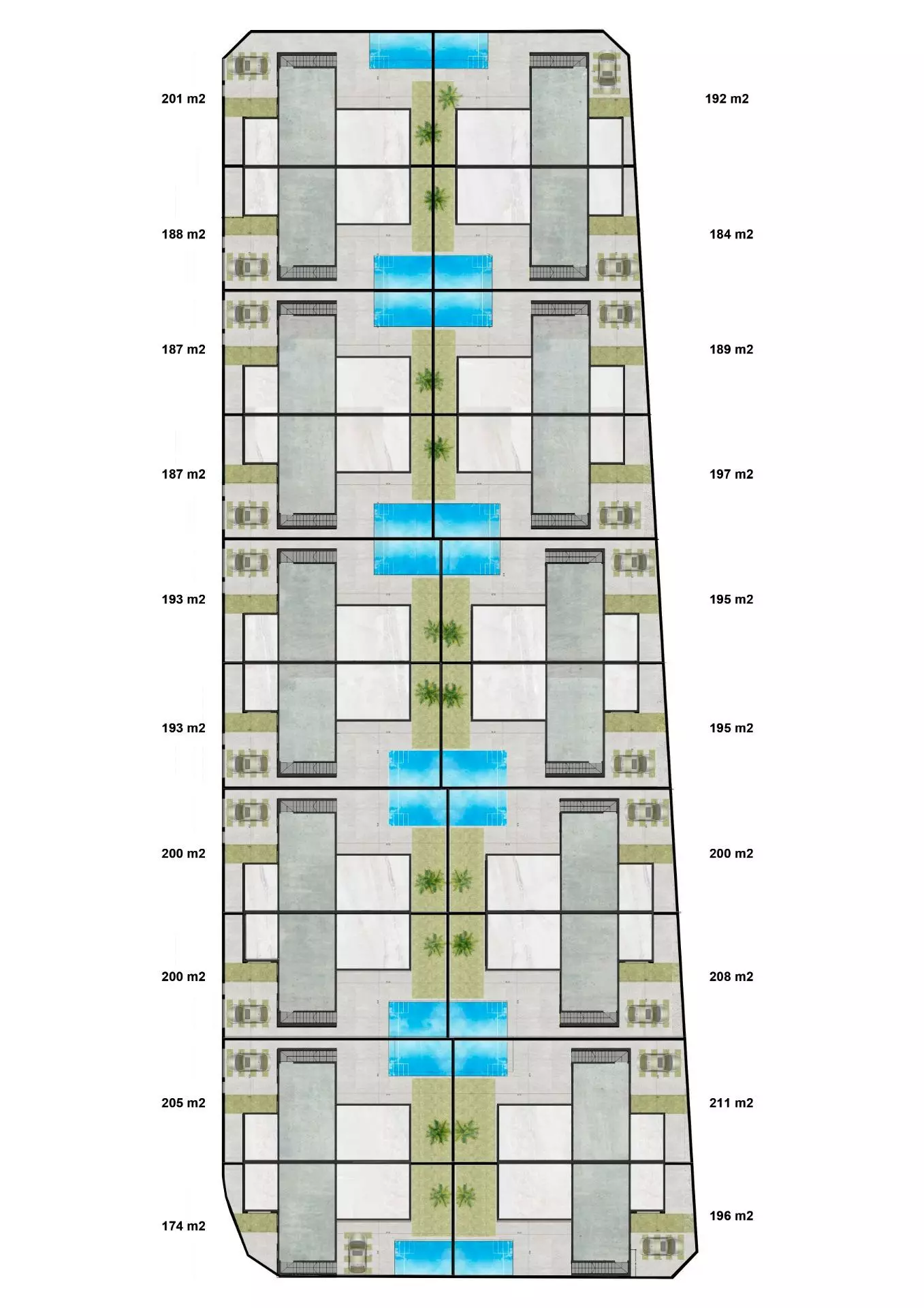 Each villa is designed on a single level, showcasing elevated ceilings in the kitchen area. This thoughtful layout includes wrap-around terrace zones on the ground floor and a large solarium on the first floor. This design not only maximizes space but also allows for ample sunlight throughout the year.
