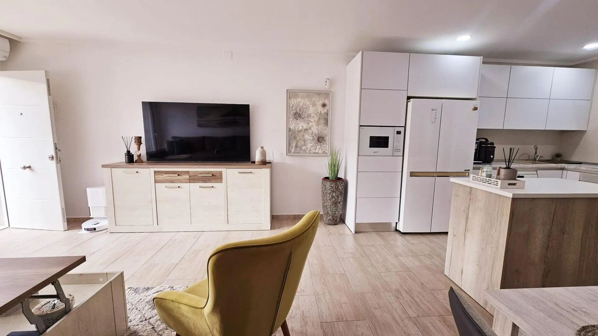 The living room features French windows that enhance natural light, making the area feel bright and open. This space allows for various furniture arrangements and activities. The kitchen is fully equipped with standard appliances, facilitating meal preparation and dining experiences.