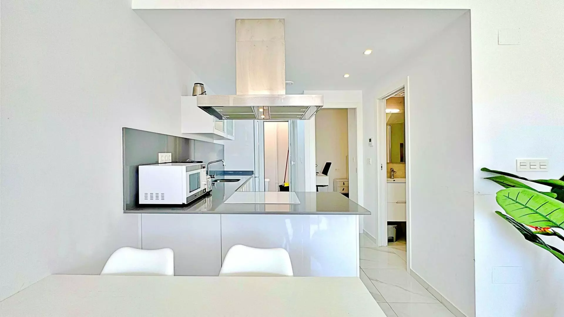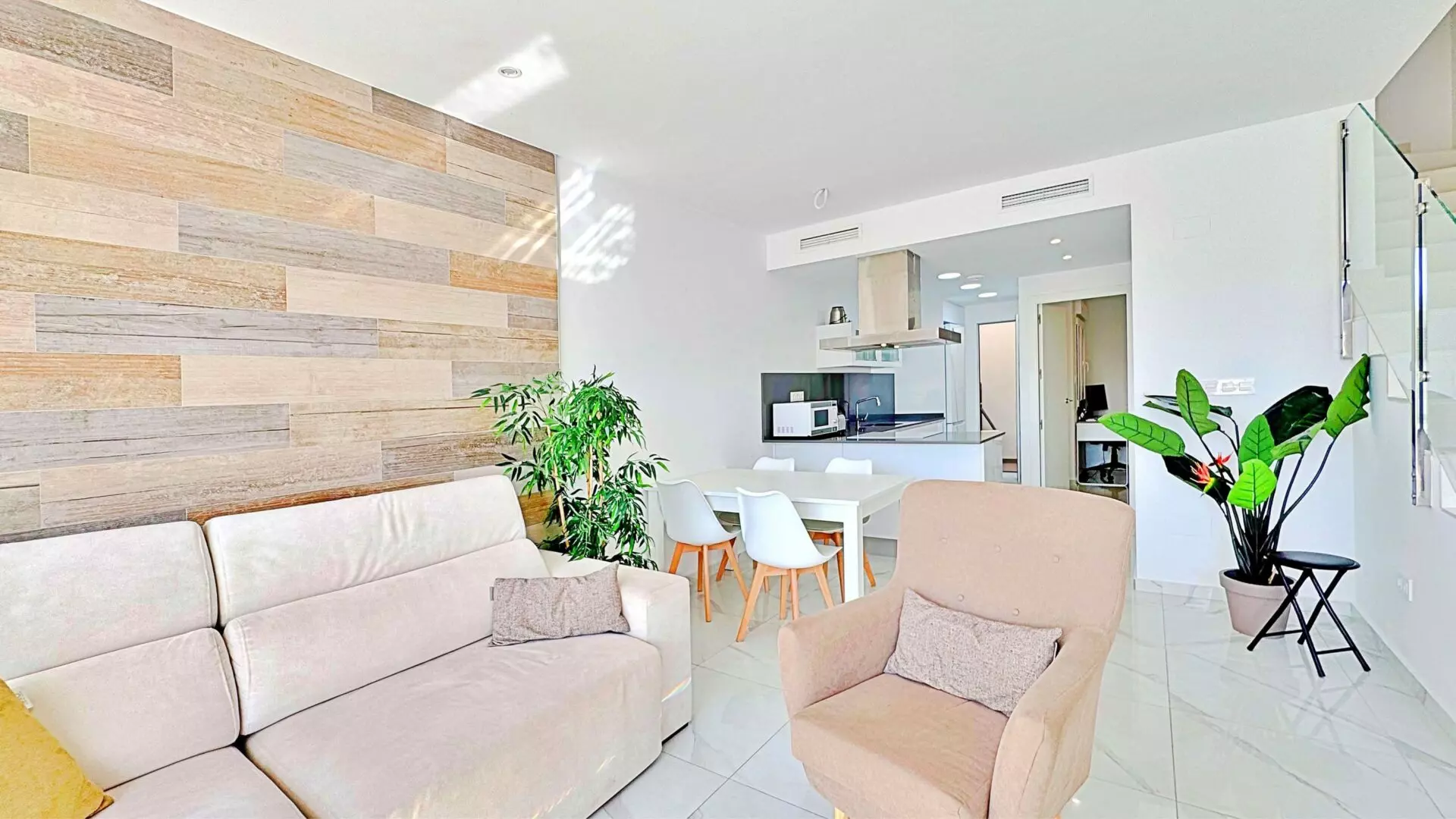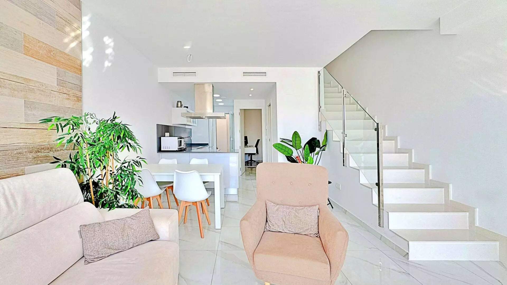 This three-bedroom, three-bathroom duplex townhouse is positioned in the residential area of Los Balcones in Torrevieja. The design focuses on functionality and effective use of space, provided through bright interiors and generous terraces that facilitate a Mediterranean lifestyle.
