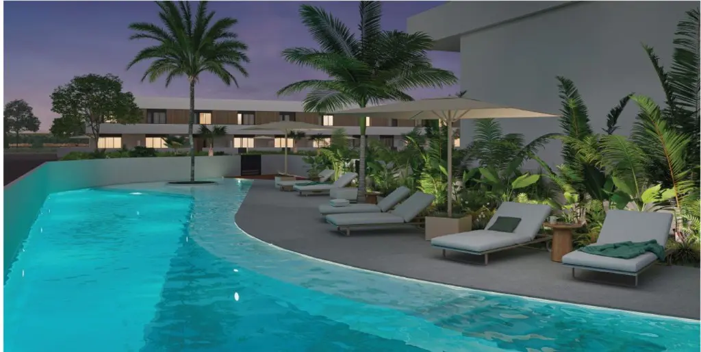 This complex offers a swimming pool, ideal for relaxation or exercise during warm months. All units adhere to modern building standards. The properties also include pre-installation for a central air conditioning system, addressing climate needs throughout the year. Additionally, bathrooms and kitchens come furnished, which can simplify the moving process.