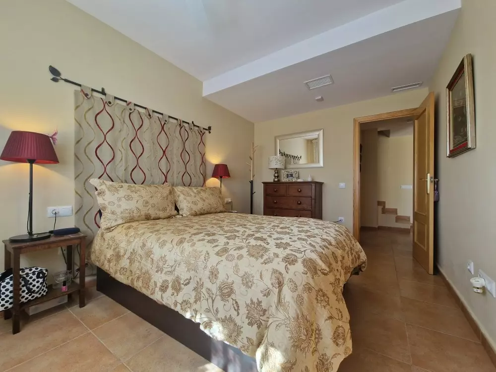 As you enter the house, a spacious living room welcomes you. The large windows ensure that the space receives ample natural light, creating an open and airy atmosphere. The kitchen is both open and modern, finished with high-end appliances that make cooking a straightforward task. On this floor, you’ll also find a bedroom that includes a built-in wardrobe, alongside a full bathroom. The living room leads directly to a private terrace, which overlooks the pool and mountains, providing an inviting space for outdoor relaxation. Additionally, there is a sizable patio located next to the main entrance, enhancing the outdoor experience.