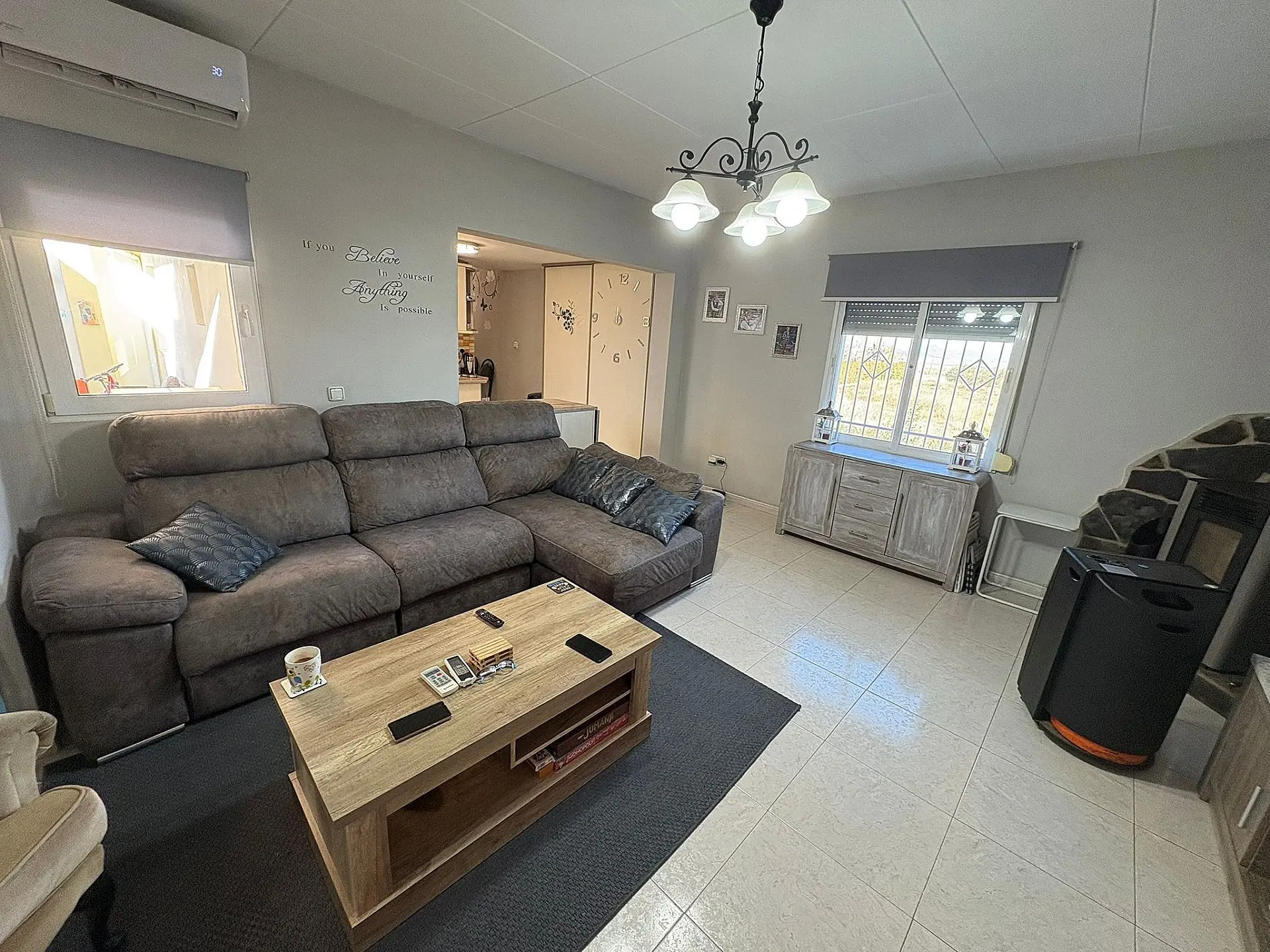 The living room is spacious and bright, thanks to its double-glazed windows that optimize temperature and acoustic insulation. In addition, the house has a pellet cooker that provides efficient and pleasant warmth in the colder months. Each room is equipped with air conditioning to ensure maximum well-being all year round.
