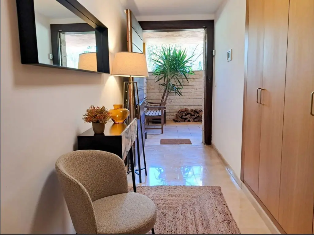 Additional features include a living room with a fireplace, pre-installation for a lift, a private garage for two vehicles, and extra outdoor parking. Situated within a private residential complex offering a communal swimming pool and well-maintained gardens, this property is ideal for those seeking to live surrounded by nature without sacrificing the comforts of city life in Marbella.