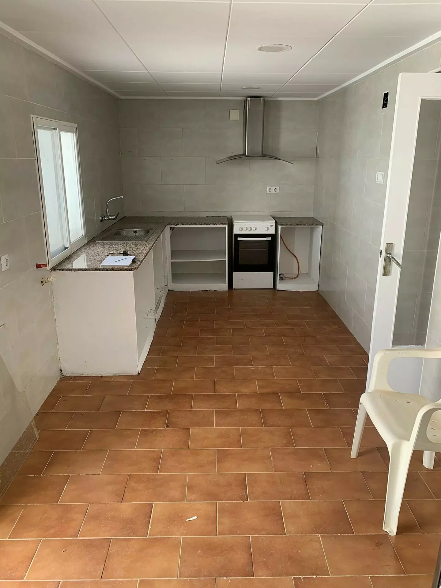 The kitchen opens up to a small patio that includes a sizable barbecue setup, along with water and drainage facilities. Behind this patio, residents have access to a small communal garden shared with neighbors.