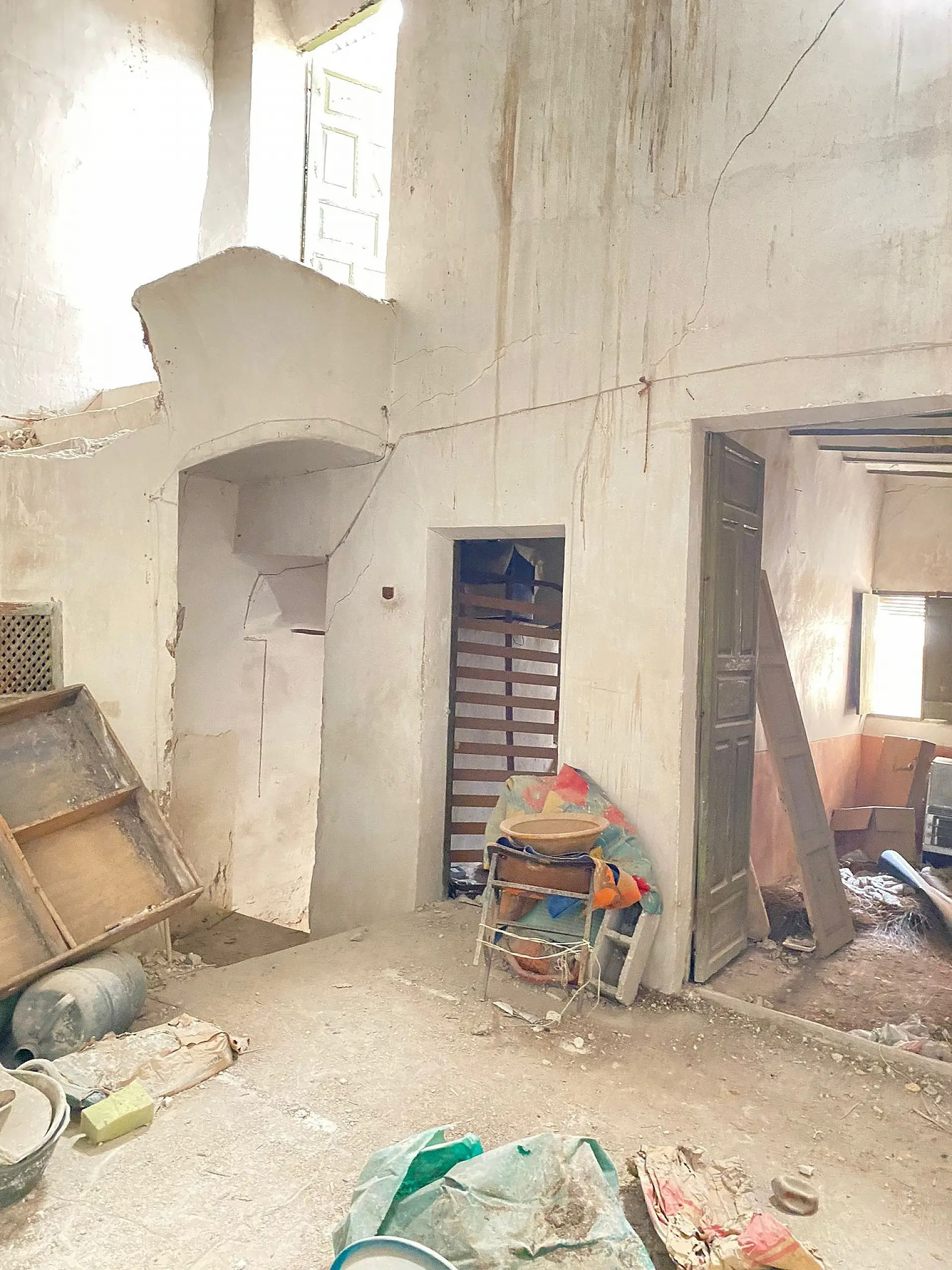 The property requires a complete renovation, offering the potential for a 5-bedroom layout. Currently, it features 2 bedrooms along with a large living space on the ground floor. Additionally, there is a private central courtyard that presents an opportunity to create an outdoor summer kitchen and dining area, ideal for gatherings or outdoor cooking.