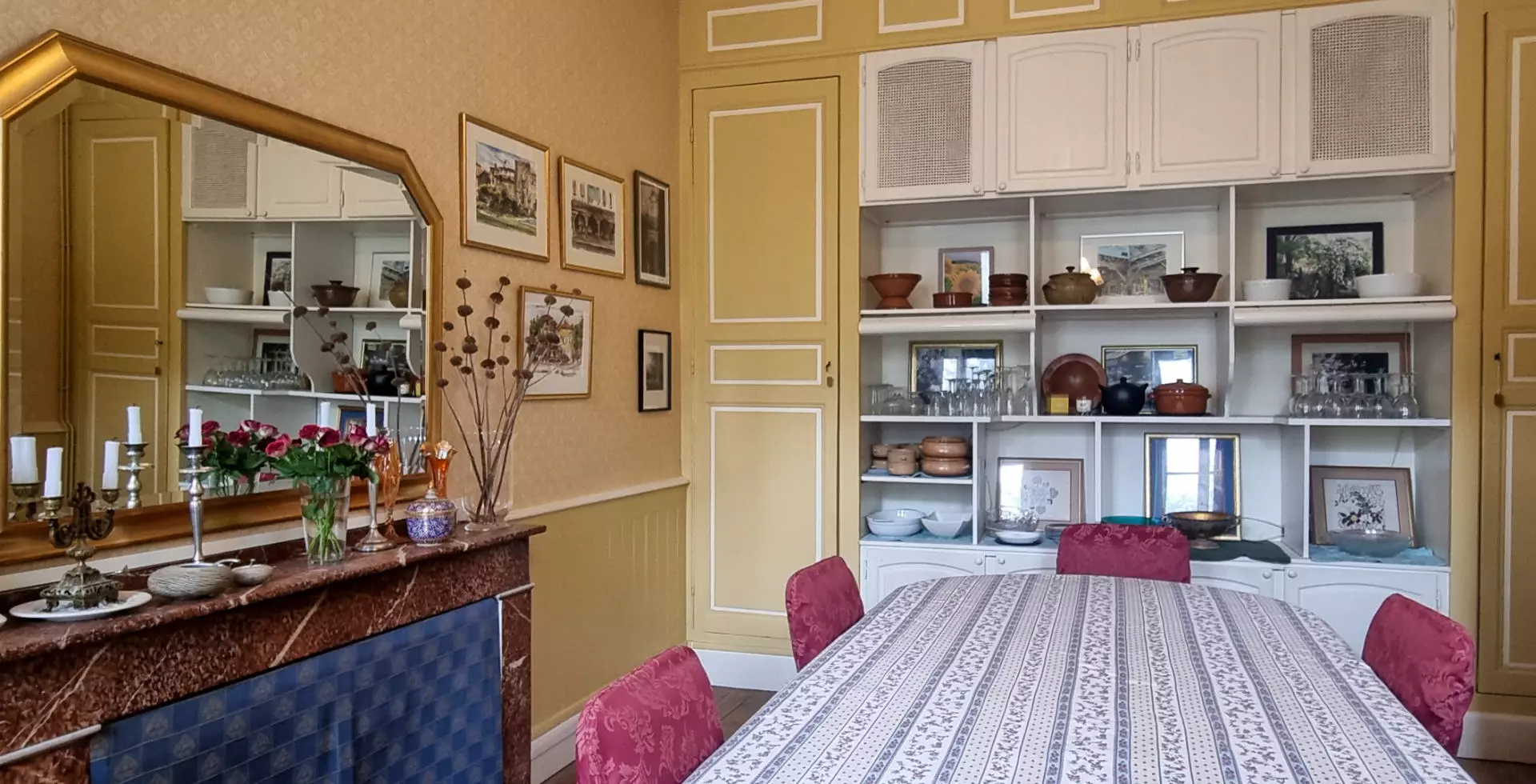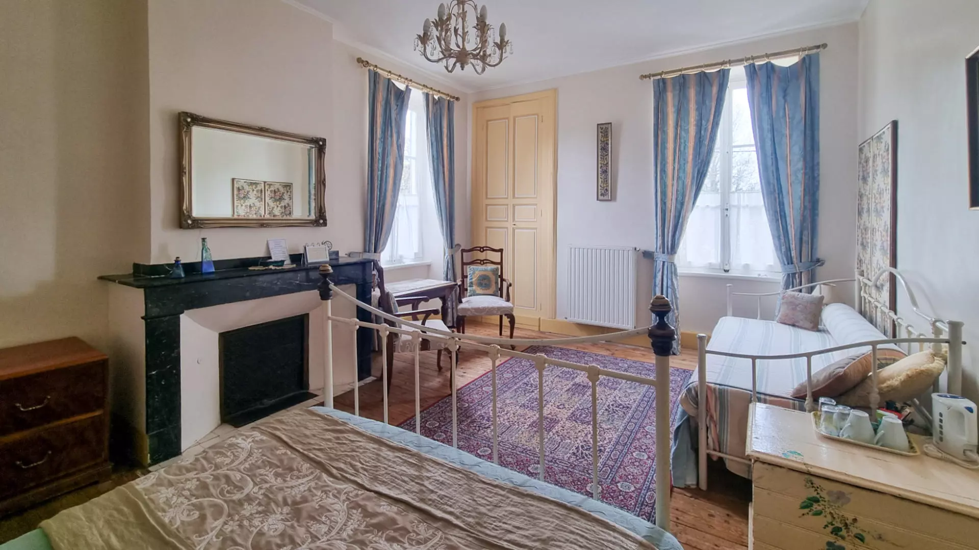 The entrance to the main house presents a grand hall that leads into a sitting room, equipped with parquet flooring and large windows that allow natural light to filter in. Continuing through the hallway, there’s a farmhouse-style kitchen in addition to a separate dining room. A glazed door leads out to the chapel ruins, now serving as an outdoor dining space.