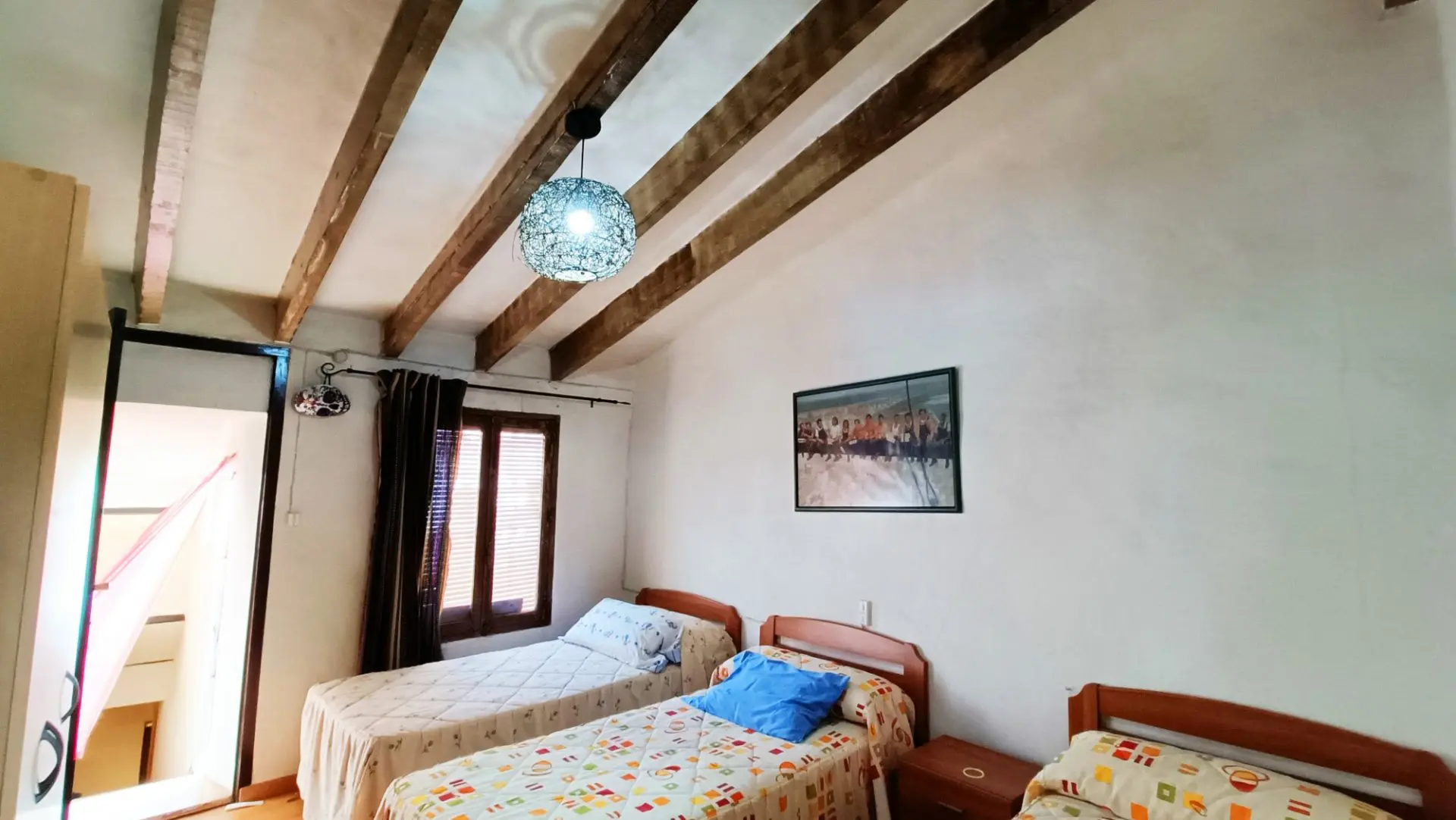 The first floor includes two bedrooms with wooden beam ceilings. This traditional element enhances the space. A private terrace is also available, offering a space to relax and enjoy the outdoor atmosphere or have a morning coffee while taking in the surroundings.