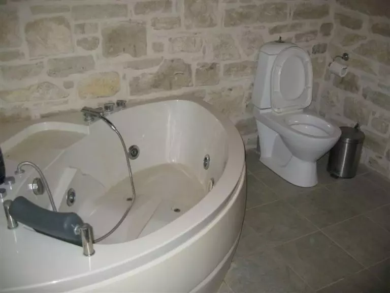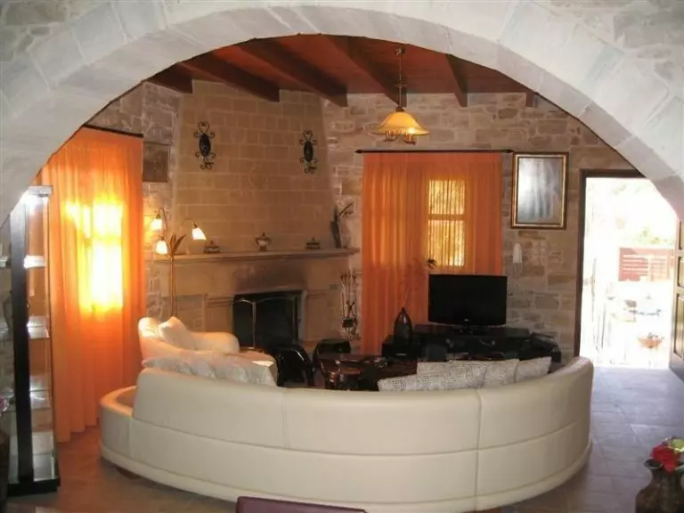 The villa offers three bedrooms. The living room is a notable space, featuring a fireplace, distinctive arches, and wooden ceilings. The kitchen is fully equipped, and the bathroom includes a hydromassage function.