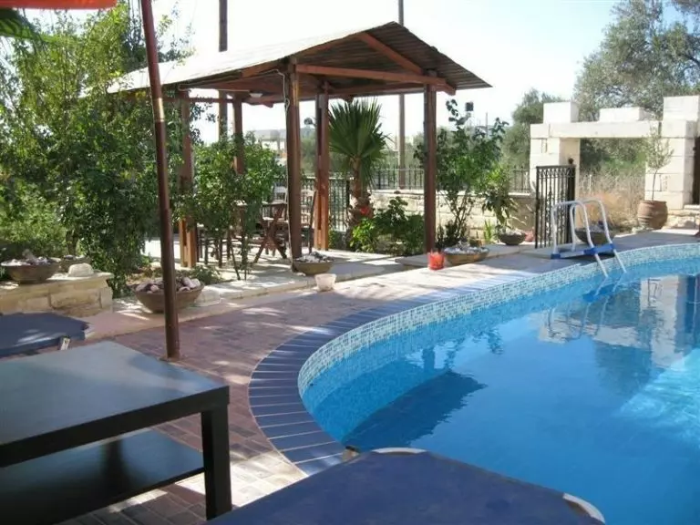 Outside, the property boasts a private swimming pool. The garden is planted with trees and flowers, and there is a covered area for barbecues.