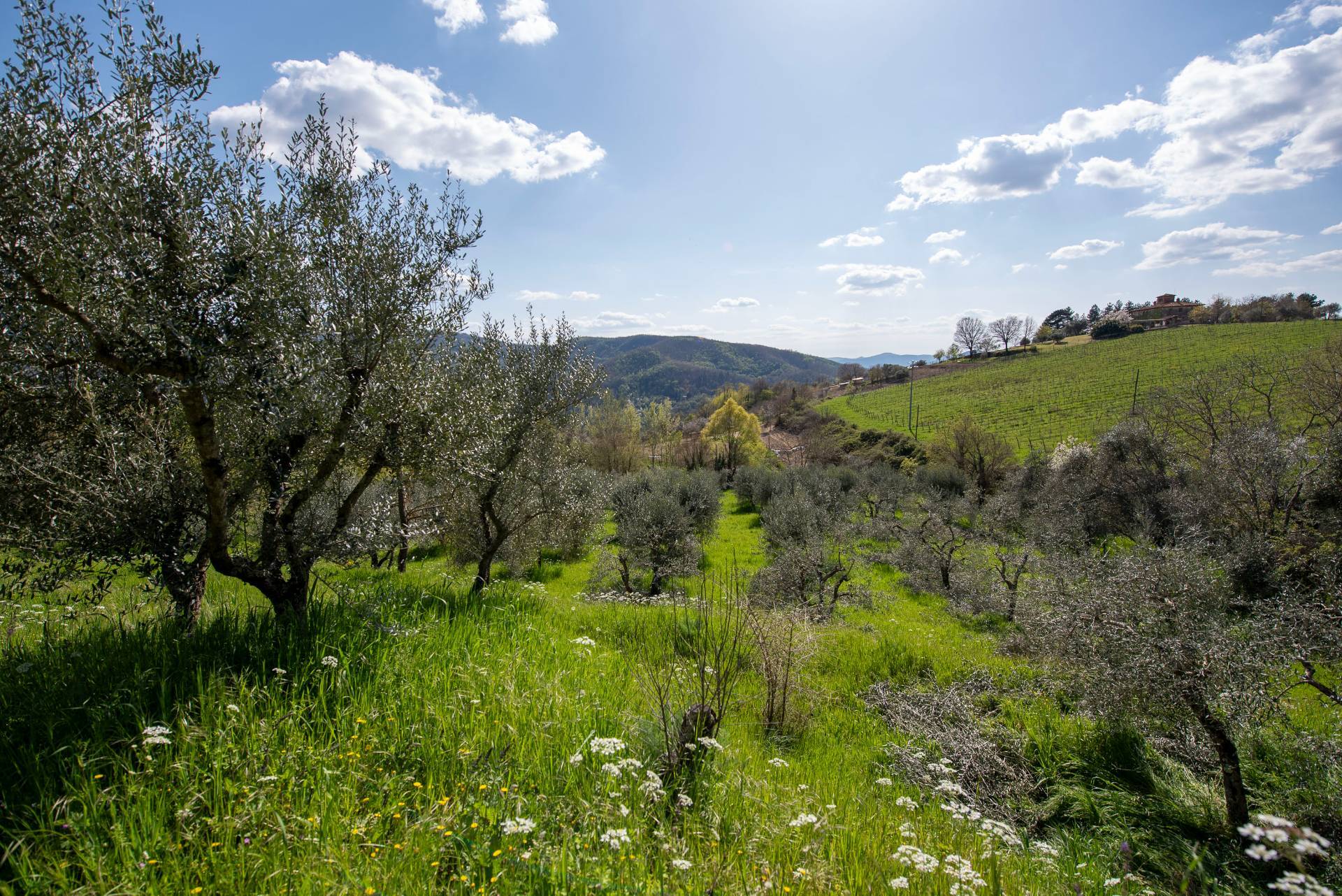 The property is surrounded by 11,000 sqm of cultivated land that includes a vineyard, olive grove, fruit trees, walnut trees, a chestnut tree, woodland, and a fenced pond.