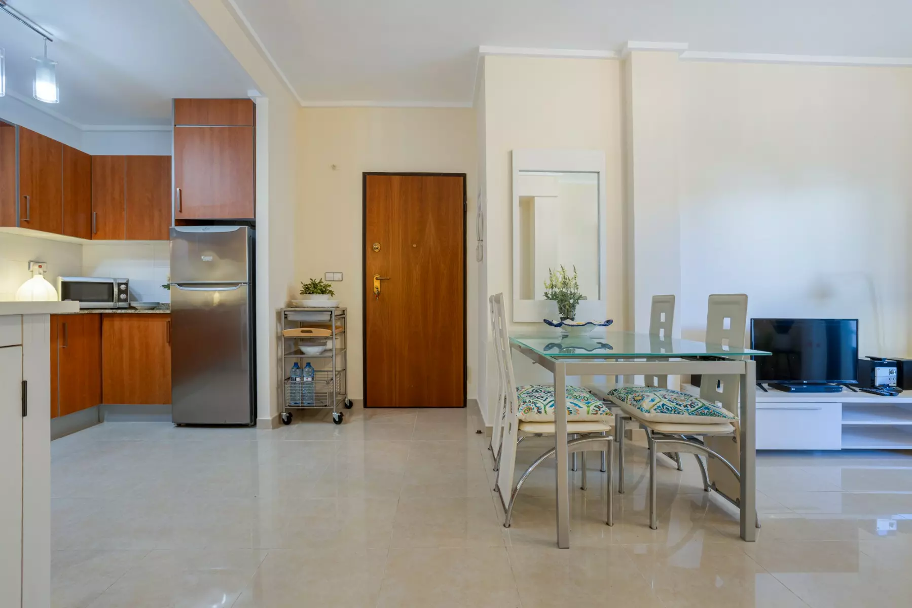 The apartment includes two bedrooms. Both have fitted wardrobes, providing sufficient storage space. The bathroom is also fully equipped with functional fixtures. This property is presented in good condition and comes fully furnished. It includes all necessary electrical appliances in the kitchen and features air conditioning to ensure a comfortable environment throughout the year.
