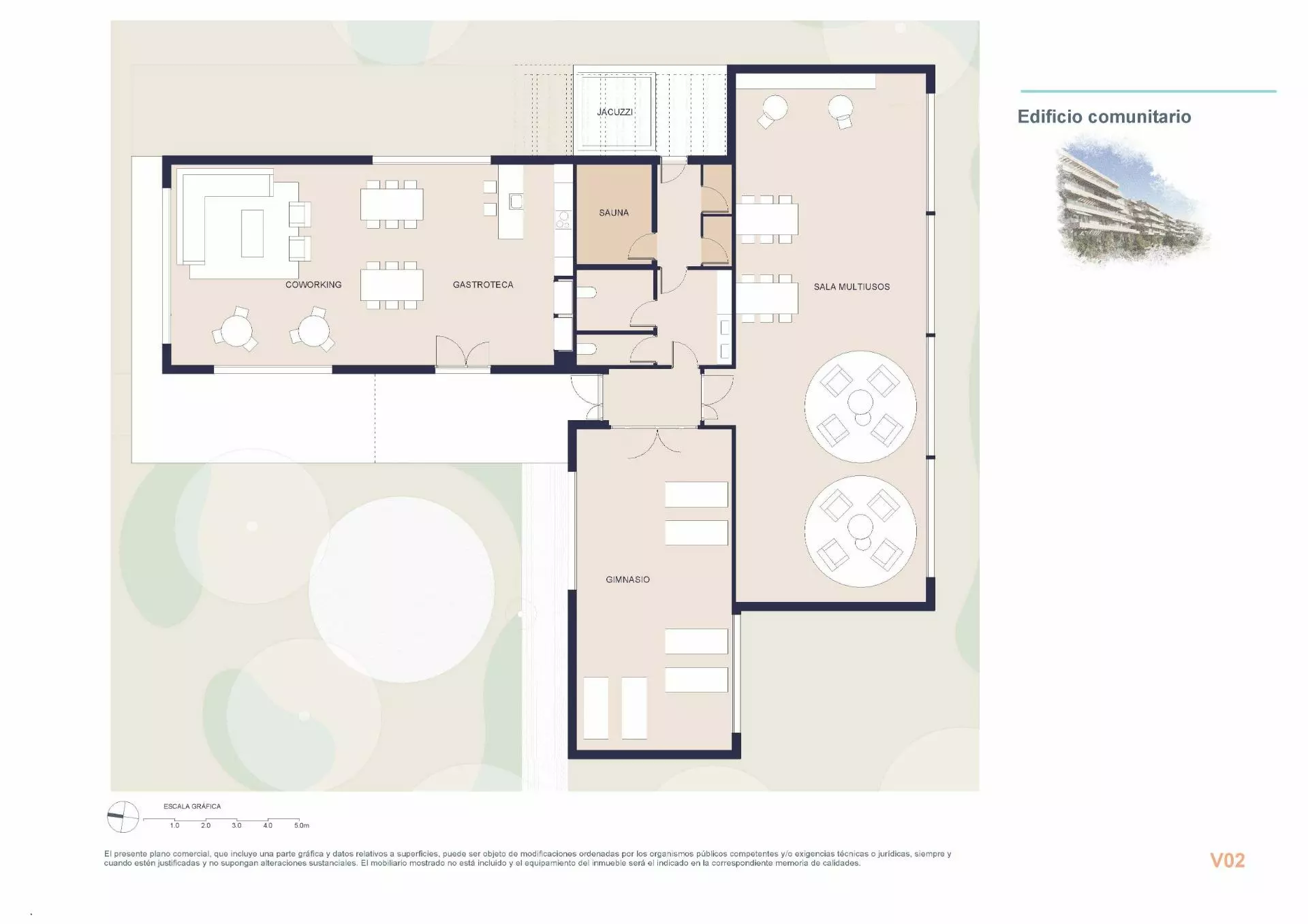 For fitness enthusiasts, the complex includes a gym and outdoor exercise area, along with a bike and running lane. More communal features include a co-working space and gastroteca for events, providing versatile areas for socializing or working. For relaxation, amenities such as a sauna, jacuzzi, and a chill-out area are also available.