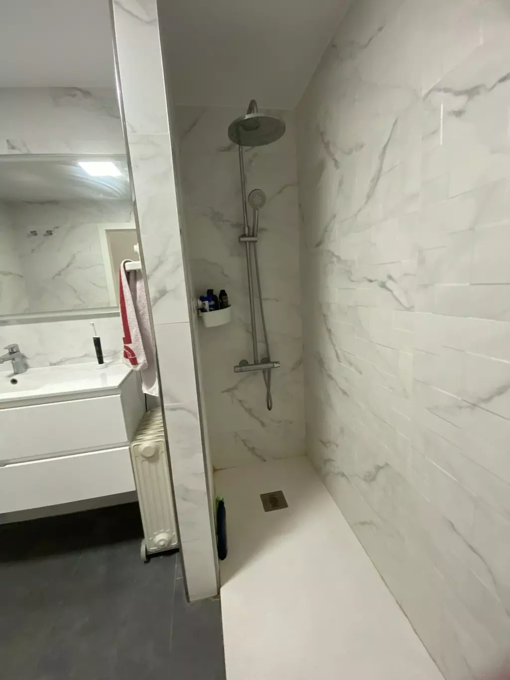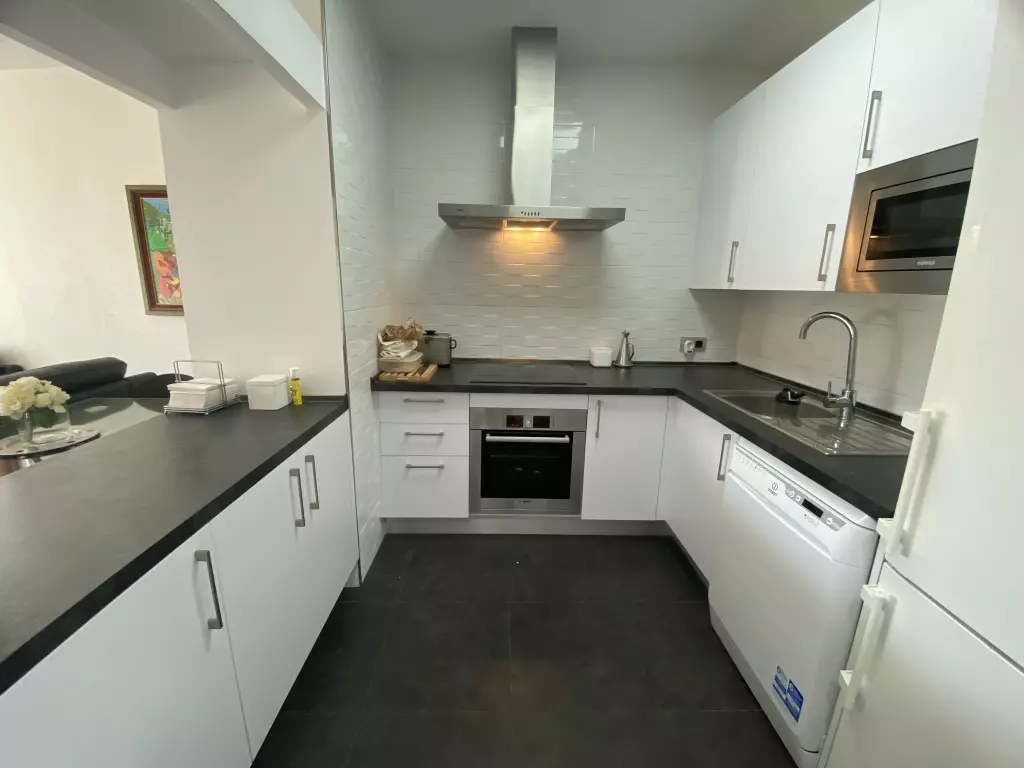 Designed for functionality, the apartment features a fully equipped kitchen that makes meal preparation convenient. The living space includes marble floors and renovated bathrooms, contributing to the overall clean and modern aesthetic. Built-in wardrobes provide ample storage space, while the spacious living room offers room for relaxation or entertaining guests.