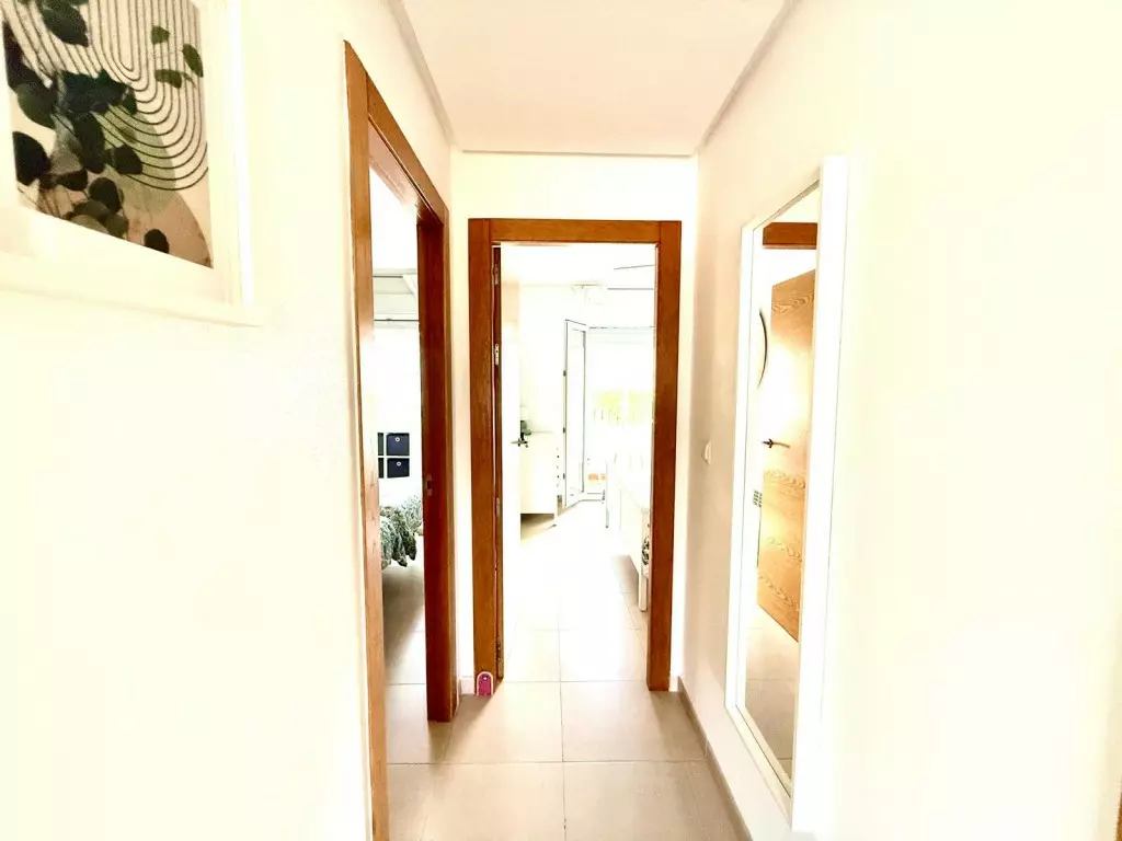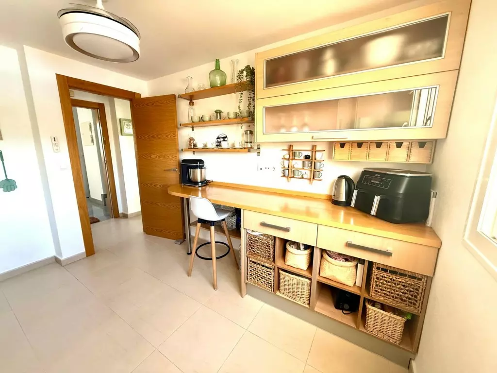 Upon entering the apartment, the design draws immediate attention. The large, fully fitted kitchen includes a window with a Roman blind that overlooks the communal pool. Upgrades in the kitchen include extra storage, gas boiler, and white goods. It also features a ceiling fan light, making it ready for immediate use.