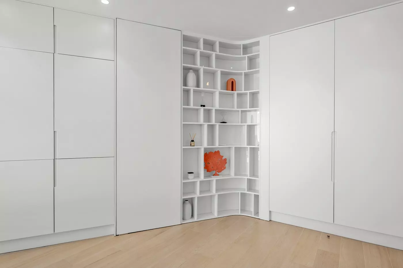 The apartment showcases a modern design that prioritizes functionality. The open-plan kitchen includes a unique closing feature, allowing for versatility in space usage. The living room benefits from natural light due to floor-to-ceiling sliding doors, providing a visual connection to the outdoor environment. This design emphasizes a fluid transition between indoor and outdoor living, enhancing the overall experience.