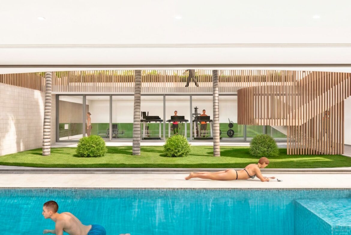The ground floor units come with private gardens, providing a view of the communal areas. If you prefer a higher vantage point, the first-floor apartments include large terraces, with some offering partial sea views. Penthouses elevate the experience with private solariums that feature sea views, outdoor kitchens, pergolas, jacuzzis, and artificial grass.