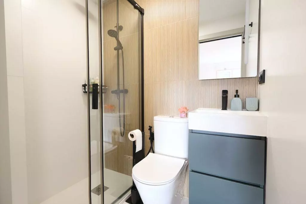 The apartment spans approximately 95 square meters, providing plenty of room for various layouts. It includes three bedrooms, which can accommodate different living arrangements, whether it is for a family or for hosting guests. The two bathrooms enhance functionality, an important aspect for those who prioritize convenience in everyday living. One of these bathrooms is en suite, ensuring added privacy for residents.