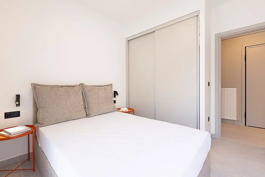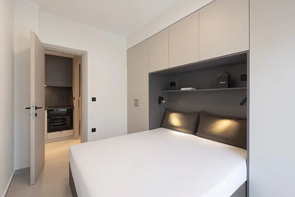 The apartment features two bedrooms, a living room with an integrated kitchen, and a shower WC. Additionally, there is a storeroom for extra storage needs. The front layout allows for natural light throughout the day, making the living space feel more open.
