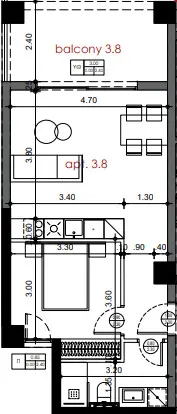 The apartment includes one bedroom, a living room that incorporates a kitchen, and one shower room with a WC. The interior layout is designed for efficiency, allowing for easy movement and access to all areas of the unit. Heating is also included, addressing seasonal temperature changes.