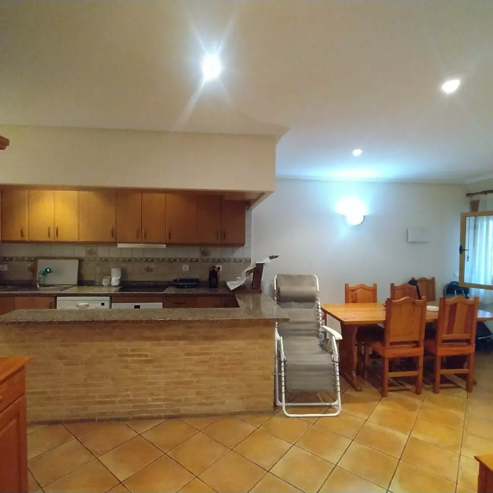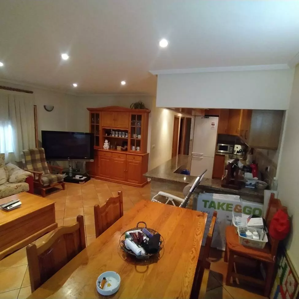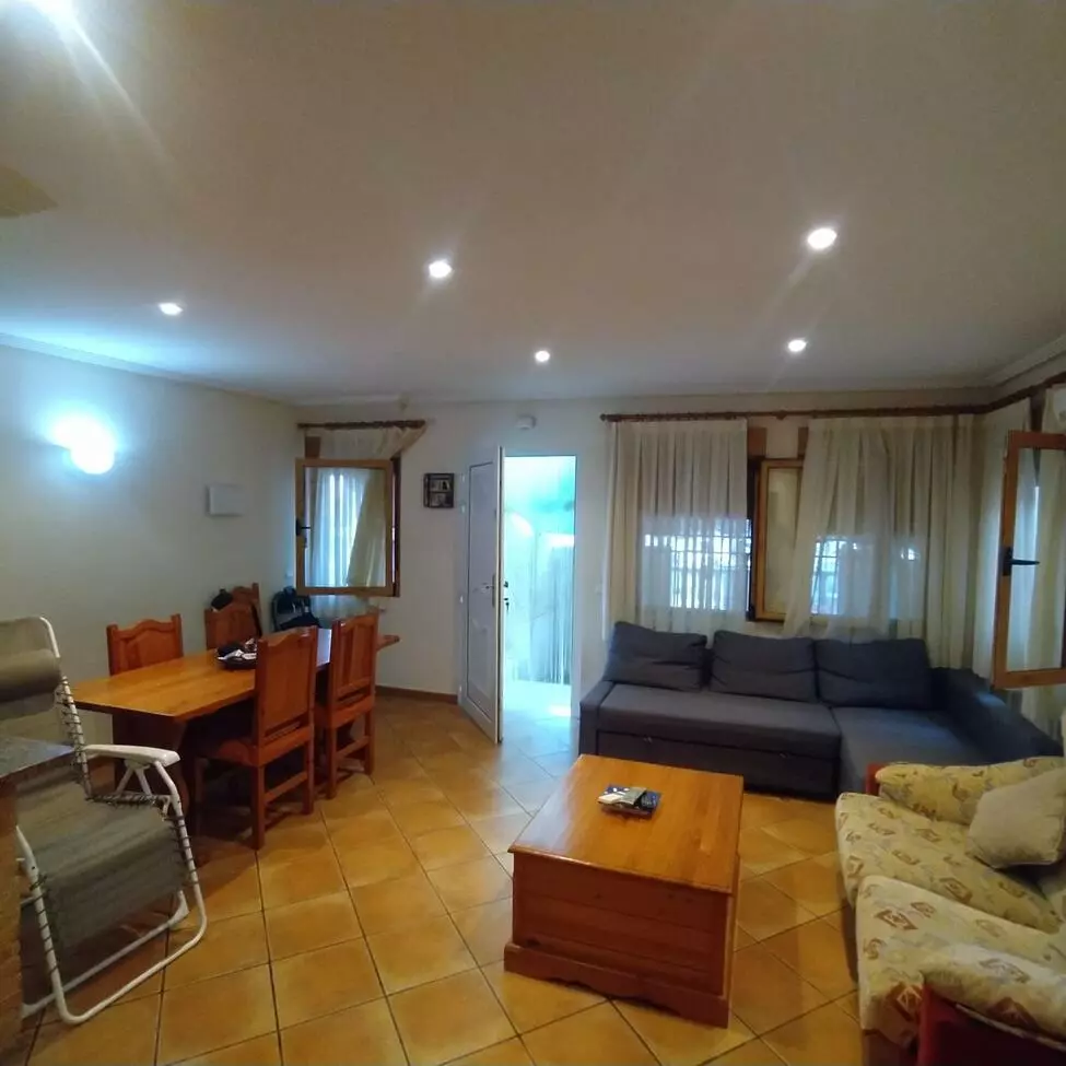 The layout consists of a spacious living-dining room, complemented by a French-style fitted kitchen that opens directly into the living space. This setup promotes a well-connected environment, ideal for entertaining or daily activities. The interior features wooden carpentry, lending a traditional touch throughout the home. Tiled floors enhance functionality, ensuring ease of maintenance.